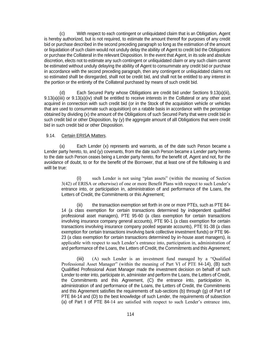 114 (c) With respect to each contingent or unliquidated claim that is an Obligation, Agent is hereby authorized, but is not required, to estimate the amount thereof for purposes of any credit bid or purchase described in the second preceding paragraph so long as the estimation of the amount or liquidation of such claim would not unduly delay the ability of Agent to credit bid the Obligations or purchase the Collateral in the relevant Disposition. In the event that Agent, in its sole and absolute discretion, elects not to estimate any such contingent or unliquidated claim or any such claim cannot be estimated without unduly delaying the ability of Agent to consummate any credit bid or purchase in accordance with the second preceding paragraph, then any contingent or unliquidated claims not so estimated shall be disregarded, shall not be credit bid, and shall not be entitled to any interest in the portion or the entirety of the Collateral purchased by means of such credit bid. (d) Each Secured Party whose Obligations are credit bid under Sections 9.13(a)(ii), 9.13(a)(iii) or 9.13(a)(iv) shall be entitled to receive interests in the Collateral or any other asset acquired in connection with such credit bid (or in the Stock of the acquisition vehicle or vehicles that are used to consummate such acquisition) on a ratable basis in accordance with the percentage obtained by dividing (x) the amount of the Obligations of such Secured Party that were credit bid in such credit bid or other Disposition, by (y) the aggregate amount of all Obligations that were credit bid in such credit bid or other Disposition. 9.14. Certain ERISA Matters. (a) Each Lender (x) represents and warrants, as of the date such Person became a Lender party hereto, to, and (y) covenants, from the date such Person became a Lender party hereto to the date such Person ceases being a Lender party hereto, for the benefit of, Agent and not, for the avoidance of doubt, to or for the benefit of the Borrower, that at least one of the following is and will be true: (i) such Lender is not using “plan assets” (within the meaning of Section 3(42) of ERISA or otherwise) of one or more Benefit Plans with respect to such Lender’s entrance into, or participation in, administration of and performance of the Loans, the Letters of Credit, the Commitments or this Agreement; (ii) the transaction exemption set forth in one or more PTEs, such as PTE 84- 14 (a class exemption for certain transactions determined by independent qualified professional asset managers), PTE 95-60 (a class exemption for certain transactions involving insurance company general accounts), PTE 90-1 (a class exemption for certain transactions involving insurance company pooled separate accounts), PTE 91-38 (a class exemption for certain transactions involving bank collective investment funds) or PTE 96- 23 (a class exemption for certain transactions determined by in-house asset managers), is applicable with respect to such Lender’s entrance into, participation in, administration of and performance of the Loans, the Letters of Credit, the Commitments and this Agreement; (iii) (A) such Lender is an investment fund managed by a “Qualified Professional Asset Manager” (within the meaning of Part VI of PTE 84-14), (B) such Qualified Professional Asset Manager made the investment decision on behalf of such Lender to enter into, participate in, administer and perform the Loans, the Letters of Credit, the Commitments and this Agreement, (C) the entrance into, participation in, administration of and performance of the Loans, the Letters of Credit, the Commitments and this Agreement satisfies the requirements of sub-sections (b) through (g) of Part I of PTE 84-14 and (D) to the best knowledge of such Lender, the requirements of subsection (a) of Part I of PTE 84-14 are satisfied with respect to such Lender’s entrance into,