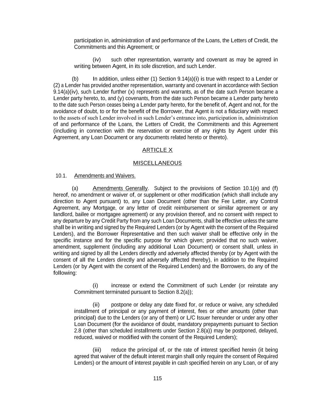 115 participation in, administration of and performance of the Loans, the Letters of Credit, the Commitments and this Agreement; or (iv) such other representation, warranty and covenant as may be agreed in writing between Agent, in its sole discretion, and such Lender. (b) In addition, unless either (1) Section 9.14(a)(i) is true with respect to a Lender or (2) a Lender has provided another representation, warranty and covenant in accordance with Section 9.14(a)(iv), such Lender further (x) represents and warrants, as of the date such Person became a Lender party hereto, to, and (y) covenants, from the date such Person became a Lender party hereto to the date such Person ceases being a Lender party hereto, for the benefit of, Agent and not, for the avoidance of doubt, to or for the benefit of the Borrower, that Agent is not a fiduciary with respect to the assets of such Lender involved in such Lender’s entrance into, participation in, administration of and performance of the Loans, the Letters of Credit, the Commitments and this Agreement (including in connection with the reservation or exercise of any rights by Agent under this Agreement, any Loan Document or any documents related hereto or thereto). ARTICLE X MISCELLANEOUS 10.1. Amendments and Waivers. (a) Amendments Generally. Subject to the provisions of Section 10.1(e) and (f) hereof, no amendment or waiver of, or supplement or other modification (which shall include any direction to Agent pursuant) to, any Loan Document (other than the Fee Letter, any Control Agreement, any Mortgage, or any letter of credit reimbursement or similar agreement or any landlord, bailee or mortgagee agreement) or any provision thereof, and no consent with respect to any departure by any Credit Party from any such Loan Documents, shall be effective unless the same shall be in writing and signed by the Required Lenders (or by Agent with the consent of the Required Lenders), and the Borrower Representative and then such waiver shall be effective only in the specific instance and for the specific purpose for which given; provided that no such waiver, amendment, supplement (including any additional Loan Document) or consent shall, unless in writing and signed by all the Lenders directly and adversely affected thereby (or by Agent with the consent of all the Lenders directly and adversely affected thereby), in addition to the Required Lenders (or by Agent with the consent of the Required Lenders) and the Borrowers, do any of the following: (i) increase or extend the Commitment of such Lender (or reinstate any Commitment terminated pursuant to Section 8.2(a)); (ii) postpone or delay any date fixed for, or reduce or waive, any scheduled installment of principal or any payment of interest, fees or other amounts (other than principal) due to the Lenders (or any of them) or L/C Issuer hereunder or under any other Loan Document (for the avoidance of doubt, mandatory prepayments pursuant to Section 2.8 (other than scheduled installments under Section 2.8(a)) may be postponed, delayed, reduced, waived or modified with the consent of the Required Lenders); (iii) reduce the principal of, or the rate of interest specified herein (it being agreed that waiver of the default interest margin shall only require the consent of Required Lenders) or the amount of interest payable in cash specified herein on any Loan, or of any