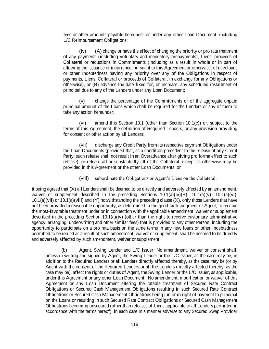 116 fees or other amounts payable hereunder or under any other Loan Document, including L/C Reimbursement Obligations; (iv) (A) change or have the effect of changing the priority or pro rata treatment of any payments (including voluntary and mandatory prepayments), Liens, proceeds of Collateral or reductions in Commitments (including as a result in whole or in part of allowing the issuance or incurrence, pursuant to this Agreement or otherwise, of new loans or other Indebtedness having any priority over any of the Obligations in respect of payments, Liens, Collateral or proceeds of Collateral, in exchange for any Obligations or otherwise), or (B) advance the date fixed for, or increase, any scheduled installment of principal due to any of the Lenders under any Loan Document; (v) change the percentage of the Commitments or of the aggregate unpaid principal amount of the Loans which shall be required for the Lenders or any of them to take any action hereunder; (vi) amend this Section 10.1 (other than Section 10.1(c)) or, subject to the terms of this Agreement, the definition of Required Lenders, or any provision providing for consent or other action by all Lenders; (vii) discharge any Credit Party from its respective payment Obligations under the Loan Documents (provided that, as a condition precedent to the release of any Credit Party, such release shall not result in an Overadvance after giving pro forma effect to such release), or release all or substantially all of the Collateral, except as otherwise may be provided in this Agreement or the other Loan Documents; or (viii) subordinate the Obligations or Agent’s Liens on the Collateral. it being agreed that (X) all Lenders shall be deemed to be directly and adversely affected by an amendment, waiver or supplement described in the preceding Sections 10.1(a)(iv)(B), 10.1(a)(v), 10.1(a)(vi), 10.1(a)(vii) or 10.1(a)(viii) and (Y) notwithstanding the preceding clause (X), only those Lenders that have not been provided a reasonable opportunity, as determined in the good faith judgment of Agent, to receive the most-favorable treatment under or in connection with the applicable amendment, waiver or supplement described in the preceding Section 10.1(a)(iv) (other than the right to receive customary administrative agency, arranging, underwriting and other similar fees) that is provided to any other Person, including the opportunity to participate on a pro rata basis on the same terms in any new loans or other Indebtedness permitted to be issued as a result of such amendment, waiver or supplement, shall be deemed to be directly and adversely affected by such amendment, waiver or supplement. (b) Agent, Swing Lender and L/C Issuer. No amendment, waiver or consent shall, unless in writing and signed by Agent, the Swing Lender or the L/C Issuer, as the case may be, in addition to the Required Lenders or all Lenders directly affected thereby, as the case may be (or by Agent with the consent of the Required Lenders or all the Lenders directly affected thereby, as the case may be), affect the rights or duties of Agent, the Swing Lender or the L/C Issuer, as applicable, under this Agreement or any other Loan Document. No amendment, modification or waiver of this Agreement or any Loan Document altering the ratable treatment of Secured Rate Contract Obligations or Secured Cash Management Obligations resulting in such Secured Rate Contract Obligations or Secured Cash Management Obligations being junior in right of payment to principal on the Loans or resulting in such Secured Rate Contract Obligations or Secured Cash Management Obligations becoming unsecured (other than releases of Liens applicable to all Lenders permitted in accordance with the terms hereof), in each case in a manner adverse to any Secured Swap Provider