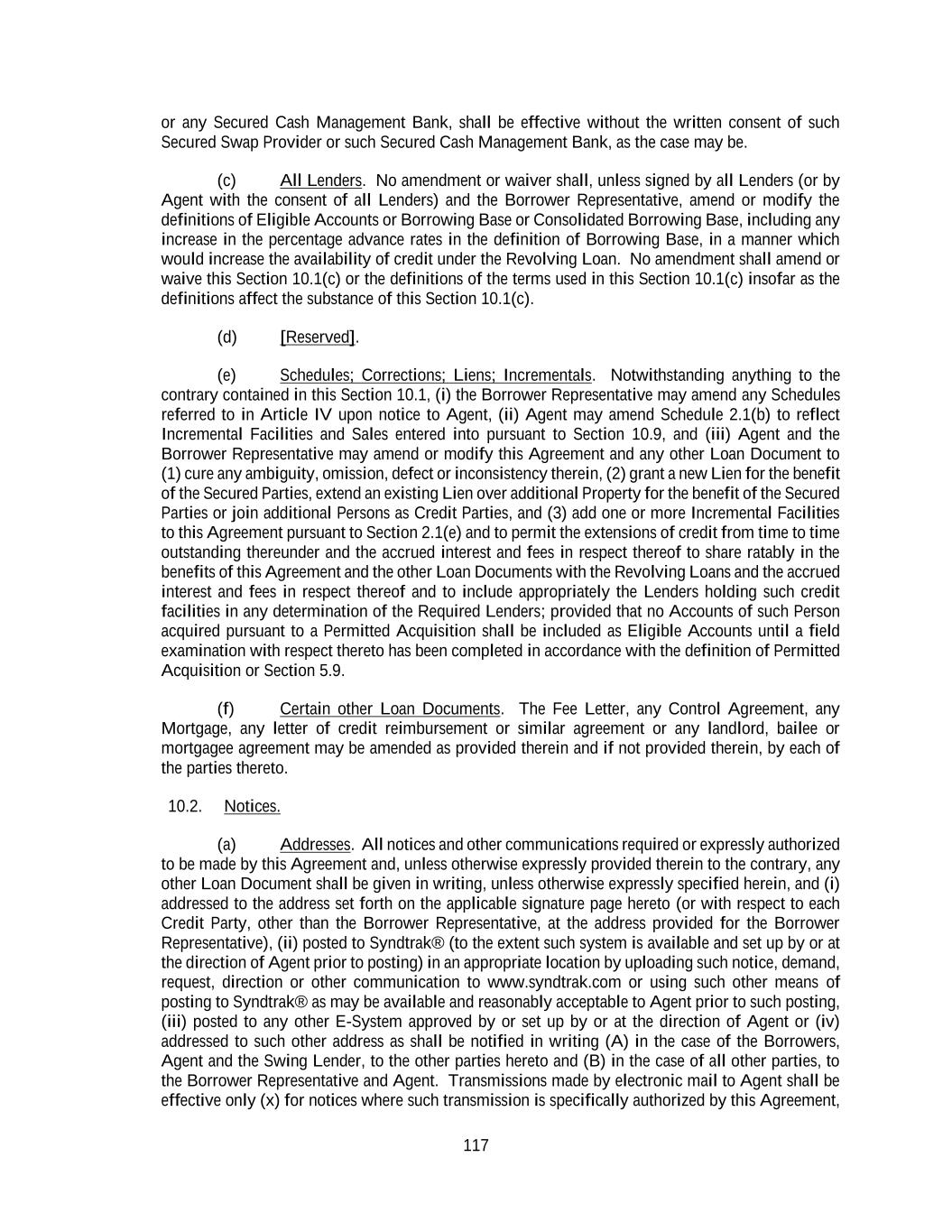 117 or any Secured Cash Management Bank, shall be effective without the written consent of such Secured Swap Provider or such Secured Cash Management Bank, as the case may be. (c) All Lenders. No amendment or waiver shall, unless signed by all Lenders (or by Agent with the consent of all Lenders) and the Borrower Representative, amend or modify the definitions of Eligible Accounts or Borrowing Base or Consolidated Borrowing Base, including any increase in the percentage advance rates in the definition of Borrowing Base, in a manner which would increase the availability of credit under the Revolving Loan. No amendment shall amend or waive this Section 10.1(c) or the definitions of the terms used in this Section 10.1(c) insofar as the definitions affect the substance of this Section 10.1(c). (d) [Reserved]. (e) Schedules; Corrections; Liens; Incrementals. Notwithstanding anything to the contrary contained in this Section 10.1, (i) the Borrower Representative may amend any Schedules referred to in Article IV upon notice to Agent, (ii) Agent may amend Schedule 2.1(b) to reflect Incremental Facilities and Sales entered into pursuant to Section 10.9, and (iii) Agent and the Borrower Representative may amend or modify this Agreement and any other Loan Document to (1) cure any ambiguity, omission, defect or inconsistency therein, (2) grant a new Lien for the benefit of the Secured Parties, extend an existing Lien over additional Property for the benefit of the Secured Parties or join additional Persons as Credit Parties, and (3) add one or more Incremental Facilities to this Agreement pursuant to Section 2.1(e) and to permit the extensions of credit from time to time outstanding thereunder and the accrued interest and fees in respect thereof to share ratably in the benefits of this Agreement and the other Loan Documents with the Revolving Loans and the accrued interest and fees in respect thereof and to include appropriately the Lenders holding such credit facilities in any determination of the Required Lenders; provided that no Accounts of such Person acquired pursuant to a Permitted Acquisition shall be included as Eligible Accounts until a field examination with respect thereto has been completed in accordance with the definition of Permitted Acquisition or Section 5.9. (f) Certain other Loan Documents. The Fee Letter, any Control Agreement, any Mortgage, any letter of credit reimbursement or similar agreement or any landlord, bailee or mortgagee agreement may be amended as provided therein and if not provided therein, by each of the parties thereto. 10.2. Notices. (a) Addresses. All notices and other communications required or expressly authorized to be made by this Agreement and, unless otherwise expressly provided therein to the contrary, any other Loan Document shall be given in writing, unless otherwise expressly specified herein, and (i) addressed to the address set forth on the applicable signature page hereto (or with respect to each Credit Party, other than the Borrower Representative, at the address provided for the Borrower Representative), (ii) posted to Syndtrak® (to the extent such system is available and set up by or at the direction of Agent prior to posting) in an appropriate location by uploading such notice, demand, request, direction or other communication to www.syndtrak.com or using such other means of posting to Syndtrak® as may be available and reasonably acceptable to Agent prior to such posting, (iii) posted to any other E-System approved by or set up by or at the direction of Agent or (iv) addressed to such other address as shall be notified in writing (A) in the case of the Borrowers, Agent and the Swing Lender, to the other parties hereto and (B) in the case of all other parties, to the Borrower Representative and Agent. Transmissions made by electronic mail to Agent shall be effective only (x) for notices where such transmission is specifically authorized by this Agreement,
