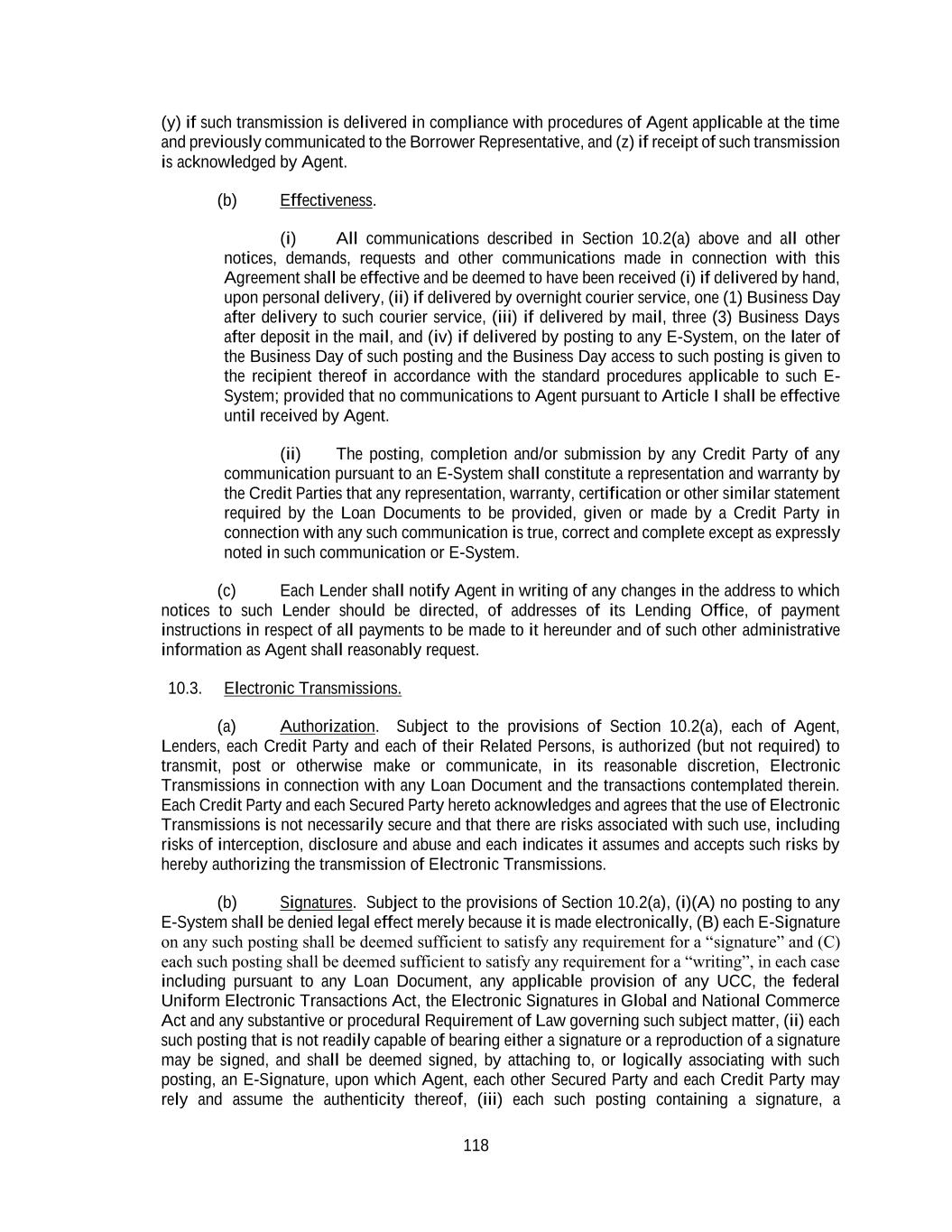 118 (y) if such transmission is delivered in compliance with procedures of Agent applicable at the time and previously communicated to the Borrower Representative, and (z) if receipt of such transmission is acknowledged by Agent. (b) Effectiveness. (i) All communications described in Section 10.2(a) above and all other notices, demands, requests and other communications made in connection with this Agreement shall be effective and be deemed to have been received (i) if delivered by hand, upon personal delivery, (ii) if delivered by overnight courier service, one (1) Business Day after delivery to such courier service, (iii) if delivered by mail, three (3) Business Days after deposit in the mail, and (iv) if delivered by posting to any E-System, on the later of the Business Day of such posting and the Business Day access to such posting is given to the recipient thereof in accordance with the standard procedures applicable to such E- System; provided that no communications to Agent pursuant to Article I shall be effective until received by Agent. (ii) The posting, completion and/or submission by any Credit Party of any communication pursuant to an E-System shall constitute a representation and warranty by the Credit Parties that any representation, warranty, certification or other similar statement required by the Loan Documents to be provided, given or made by a Credit Party in connection with any such communication is true, correct and complete except as expressly noted in such communication or E-System. (c) Each Lender shall notify Agent in writing of any changes in the address to which notices to such Lender should be directed, of addresses of its Lending Office, of payment instructions in respect of all payments to be made to it hereunder and of such other administrative information as Agent shall reasonably request. 10.3. Electronic Transmissions. (a) Authorization. Subject to the provisions of Section 10.2(a), each of Agent, Lenders, each Credit Party and each of their Related Persons, is authorized (but not required) to transmit, post or otherwise make or communicate, in its reasonable discretion, Electronic Transmissions in connection with any Loan Document and the transactions contemplated therein. Each Credit Party and each Secured Party hereto acknowledges and agrees that the use of Electronic Transmissions is not necessarily secure and that there are risks associated with such use, including risks of interception, disclosure and abuse and each indicates it assumes and accepts such risks by hereby authorizing the transmission of Electronic Transmissions. (b) Signatures. Subject to the provisions of Section 10.2(a), (i)(A) no posting to any E-System shall be denied legal effect merely because it is made electronically, (B) each E-Signature on any such posting shall be deemed sufficient to satisfy any requirement for a “signature” and (C) each such posting shall be deemed sufficient to satisfy any requirement for a “writing”, in each case including pursuant to any Loan Document, any applicable provision of any UCC, the federal Uniform Electronic Transactions Act, the Electronic Signatures in Global and National Commerce Act and any substantive or procedural Requirement of Law governing such subject matter, (ii) each such posting that is not readily capable of bearing either a signature or a reproduction of a signature may be signed, and shall be deemed signed, by attaching to, or logically associating with such posting, an E-Signature, upon which Agent, each other Secured Party and each Credit Party may rely and assume the authenticity thereof, (iii) each such posting containing a signature, a