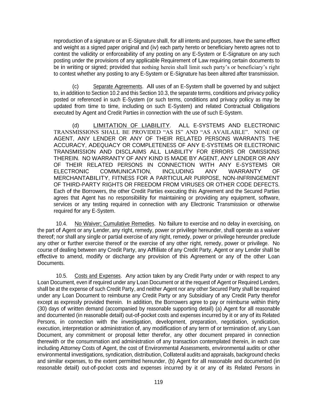 119 reproduction of a signature or an E-Signature shall, for all intents and purposes, have the same effect and weight as a signed paper original and (iv) each party hereto or beneficiary hereto agrees not to contest the validity or enforceability of any posting on any E-System or E-Signature on any such posting under the provisions of any applicable Requirement of Law requiring certain documents to be in writing or signed; provided that nothing herein shall limit such party’s or beneficiary’s right to contest whether any posting to any E-System or E-Signature has been altered after transmission. (c) Separate Agreements. All uses of an E-System shall be governed by and subject to, in addition to Section 10.2 and this Section 10.3, the separate terms, conditions and privacy policy posted or referenced in such E-System (or such terms, conditions and privacy policy as may be updated from time to time, including on such E-System) and related Contractual Obligations executed by Agent and Credit Parties in connection with the use of such E-System. (d) LIMITATION OF LIABILITY. ALL E-SYSTEMS AND ELECTRONIC TRANSMISSIONS SHALL BE PROVIDED “AS IS” AND “AS AVAILABLE”. NONE OF AGENT, ANY LENDER OR ANY OF THEIR RELATED PERSONS WARRANTS THE ACCURACY, ADEQUACY OR COMPLETENESS OF ANY E-SYSTEMS OR ELECTRONIC TRANSMISSION AND DISCLAIMS ALL LIABILITY FOR ERRORS OR OMISSIONS THEREIN. NO WARRANTY OF ANY KIND IS MADE BY AGENT, ANY LENDER OR ANY OF THEIR RELATED PERSONS IN CONNECTION WITH ANY E-SYSTEMS OR ELECTRONIC COMMUNICATION, INCLUDING ANY WARRANTY OF MERCHANTABILITY, FITNESS FOR A PARTICULAR PURPOSE, NON-INFRINGEMENT OF THIRD-PARTY RIGHTS OR FREEDOM FROM VIRUSES OR OTHER CODE DEFECTS. Each of the Borrowers, the other Credit Parties executing this Agreement and the Secured Parties agrees that Agent has no responsibility for maintaining or providing any equipment, software, services or any testing required in connection with any Electronic Transmission or otherwise required for any E-System. 10.4. No Waiver; Cumulative Remedies. No failure to exercise and no delay in exercising, on the part of Agent or any Lender, any right, remedy, power or privilege hereunder, shall operate as a waiver thereof; nor shall any single or partial exercise of any right, remedy, power or privilege hereunder preclude any other or further exercise thereof or the exercise of any other right, remedy, power or privilege. No course of dealing between any Credit Party, any Affiliate of any Credit Party, Agent or any Lender shall be effective to amend, modify or discharge any provision of this Agreement or any of the other Loan Documents. 10.5. Costs and Expenses. Any action taken by any Credit Party under or with respect to any Loan Document, even if required under any Loan Document or at the request of Agent or Required Lenders, shall be at the expense of such Credit Party, and neither Agent nor any other Secured Party shall be required under any Loan Document to reimburse any Credit Party or any Subsidiary of any Credit Party therefor except as expressly provided therein. In addition, the Borrowers agree to pay or reimburse within thirty (30) days of written demand (accompanied by reasonable supporting detail) (a) Agent for all reasonable and documented (in reasonable detail) out-of-pocket costs and expenses incurred by it or any of its Related Persons, in connection with the investigation, development, preparation, negotiation, syndication, execution, interpretation or administration of, any modification of any term of or termination of, any Loan Document, any commitment or proposal letter therefor, any other document prepared in connection therewith or the consummation and administration of any transaction contemplated therein, in each case including Attorney Costs of Agent, the cost of Environmental Assessments, environmental audits or other environmental investigations, syndication, distribution, Collateral audits and appraisals, background checks and similar expenses, to the extent permitted hereunder, (b) Agent for all reasonable and documented (in reasonable detail) out-of-pocket costs and expenses incurred by it or any of its Related Persons in