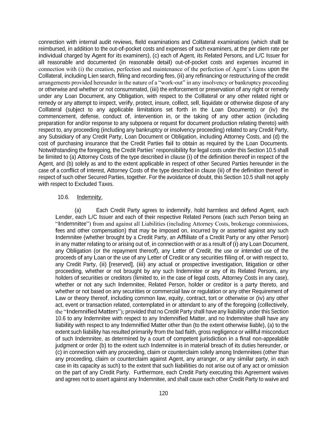 120 connection with internal audit reviews, field examinations and Collateral examinations (which shall be reimbursed, in addition to the out-of-pocket costs and expenses of such examiners, at the per diem rate per individual charged by Agent for its examiners), (c) each of Agent, its Related Persons, and L/C Issuer for all reasonable and documented (in reasonable detail) out-of-pocket costs and expenses incurred in connection with (i) the creation, perfection and maintenance of the perfection of Agent’s Liens upon the Collateral, including Lien search, filing and recording fees, (ii) any refinancing or restructuring of the credit arrangements provided hereunder in the nature of a “work-out” in any insolvency or bankruptcy proceeding or otherwise and whether or not consummated, (iii) the enforcement or preservation of any right or remedy under any Loan Document, any Obligation, with respect to the Collateral or any other related right or remedy or any attempt to inspect, verify, protect, insure, collect, sell, liquidate or otherwise dispose of any Collateral (subject to any applicable limitations set forth in the Loan Documents) or (iv) the commencement, defense, conduct of, intervention in, or the taking of any other action (including preparation for and/or response to any subpoena or request for document production relating thereto) with respect to, any proceeding (including any bankruptcy or insolvency proceeding) related to any Credit Party, any Subsidiary of any Credit Party, Loan Document or Obligation, including Attorney Costs, and (d) the cost of purchasing insurance that the Credit Parties fail to obtain as required by the Loan Documents. Notwithstanding the foregoing, the Credit Parties’ responsibility for legal costs under this Section 10.5 shall be limited to (a) Attorney Costs of the type described in clause (i) of the definition thereof in respect of the Agent, and (b) solely as and to the extent applicable in respect of other Secured Parties hereunder in the case of a conflict of interest, Attorney Costs of the type described in clause (ii) of the definition thereof in respect of such other Secured Parties, together. For the avoidance of doubt, this Section 10.5 shall not apply with respect to Excluded Taxes. 10.6. Indemnity. (a) Each Credit Party agrees to indemnify, hold harmless and defend Agent, each Lender, each L/C Issuer and each of their respective Related Persons (each such Person being an “Indemnitee”) from and against all Liabilities (including Attorney Costs, brokerage commissions, fees and other compensation) that may be imposed on, incurred by or asserted against any such Indemnitee (whether brought by a Credit Party, an Affiliate of a Credit Party or any other Person) in any matter relating to or arising out of, in connection with or as a result of (i) any Loan Document, any Obligation (or the repayment thereof), any Letter of Credit, the use or intended use of the proceeds of any Loan or the use of any Letter of Credit or any securities filing of, or with respect to, any Credit Party, (ii) [reserved], (iii) any actual or prospective investigation, litigation or other proceeding, whether or not brought by any such Indemnitee or any of its Related Persons, any holders of securities or creditors (limited to, in the case of legal costs, Attorney Costs in any case), whether or not any such Indemnitee, Related Person, holder or creditor is a party thereto, and whether or not based on any securities or commercial law or regulation or any other Requirement of Law or theory thereof, including common law, equity, contract, tort or otherwise or (iv) any other act, event or transaction related, contemplated in or attendant to any of the foregoing (collectively, the “Indemnified Matters”); provided that no Credit Party shall have any liability under this Section 10.6 to any Indemnitee with respect to any Indemnified Matter, and no Indemnitee shall have any liability with respect to any Indemnified Matter other than (to the extent otherwise liable), (a) to the extent such liability has resulted primarily from the bad faith, gross negligence or willful misconduct of such Indemnitee, as determined by a court of competent jurisdiction in a final non-appealable judgment or order (b) to the extent such Indemnitee is in material breach of its duties hereunder, or (c) in connection with any proceeding, claim or counterclaim solely among Indemnitees (other than any proceeding, claim or counterclaim against Agent, any arranger, or any similar party, in each case in its capacity as such) to the extent that such liabilities do not arise out of any act or omission on the part of any Credit Party. Furthermore, each Credit Party executing this Agreement waives and agrees not to assert against any Indemnitee, and shall cause each other Credit Party to waive and