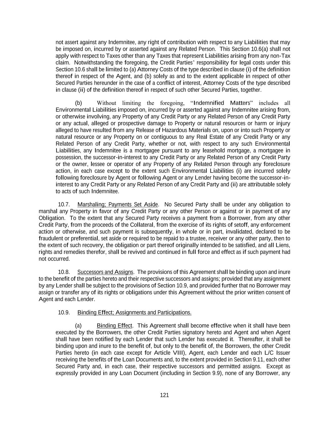 121 not assert against any Indemnitee, any right of contribution with respect to any Liabilities that may be imposed on, incurred by or asserted against any Related Person. This Section 10.6(a) shall not apply with respect to Taxes other than any Taxes that represent Liabilities arising from any non-Tax claim. Notwithstanding the foregoing, the Credit Parties’ responsibility for legal costs under this Section 10.6 shall be limited to (a) Attorney Costs of the type described in clause (i) of the definition thereof in respect of the Agent, and (b) solely as and to the extent applicable in respect of other Secured Parties hereunder in the case of a conflict of interest, Attorney Costs of the type described in clause (ii) of the definition thereof in respect of such other Secured Parties, together. (b) Without limiting the foregoing, “Indemnified Matters” includes all Environmental Liabilities imposed on, incurred by or asserted against any Indemnitee arising from, or otherwise involving, any Property of any Credit Party or any Related Person of any Credit Party or any actual, alleged or prospective damage to Property or natural resources or harm or injury alleged to have resulted from any Release of Hazardous Materials on, upon or into such Property or natural resource or any Property on or contiguous to any Real Estate of any Credit Party or any Related Person of any Credit Party, whether or not, with respect to any such Environmental Liabilities, any Indemnitee is a mortgagee pursuant to any leasehold mortgage, a mortgagee in possession, the successor-in-interest to any Credit Party or any Related Person of any Credit Party or the owner, lessee or operator of any Property of any Related Person through any foreclosure action, in each case except to the extent such Environmental Liabilities (i) are incurred solely following foreclosure by Agent or following Agent or any Lender having become the successor-in- interest to any Credit Party or any Related Person of any Credit Party and (ii) are attributable solely to acts of such Indemnitee. 10.7. Marshaling; Payments Set Aside. No Secured Party shall be under any obligation to marshal any Property in favor of any Credit Party or any other Person or against or in payment of any Obligation. To the extent that any Secured Party receives a payment from a Borrower, from any other Credit Party, from the proceeds of the Collateral, from the exercise of its rights of setoff, any enforcement action or otherwise, and such payment is subsequently, in whole or in part, invalidated, declared to be fraudulent or preferential, set aside or required to be repaid to a trustee, receiver or any other party, then to the extent of such recovery, the obligation or part thereof originally intended to be satisfied, and all Liens, rights and remedies therefor, shall be revived and continued in full force and effect as if such payment had not occurred. 10.8. Successors and Assigns. The provisions of this Agreement shall be binding upon and inure to the benefit of the parties hereto and their respective successors and assigns; provided that any assignment by any Lender shall be subject to the provisions of Section 10.9, and provided further that no Borrower may assign or transfer any of its rights or obligations under this Agreement without the prior written consent of Agent and each Lender. 10.9. Binding Effect; Assignments and Participations. (a) Binding Effect. This Agreement shall become effective when it shall have been executed by the Borrowers, the other Credit Parties signatory hereto and Agent and when Agent shall have been notified by each Lender that such Lender has executed it. Thereafter, it shall be binding upon and inure to the benefit of, but only to the benefit of, the Borrowers, the other Credit Parties hereto (in each case except for Article VIII), Agent, each Lender and each L/C Issuer receiving the benefits of the Loan Documents and, to the extent provided in Section 9.11, each other Secured Party and, in each case, their respective successors and permitted assigns. Except as expressly provided in any Loan Document (including in Section 9.9), none of any Borrower, any