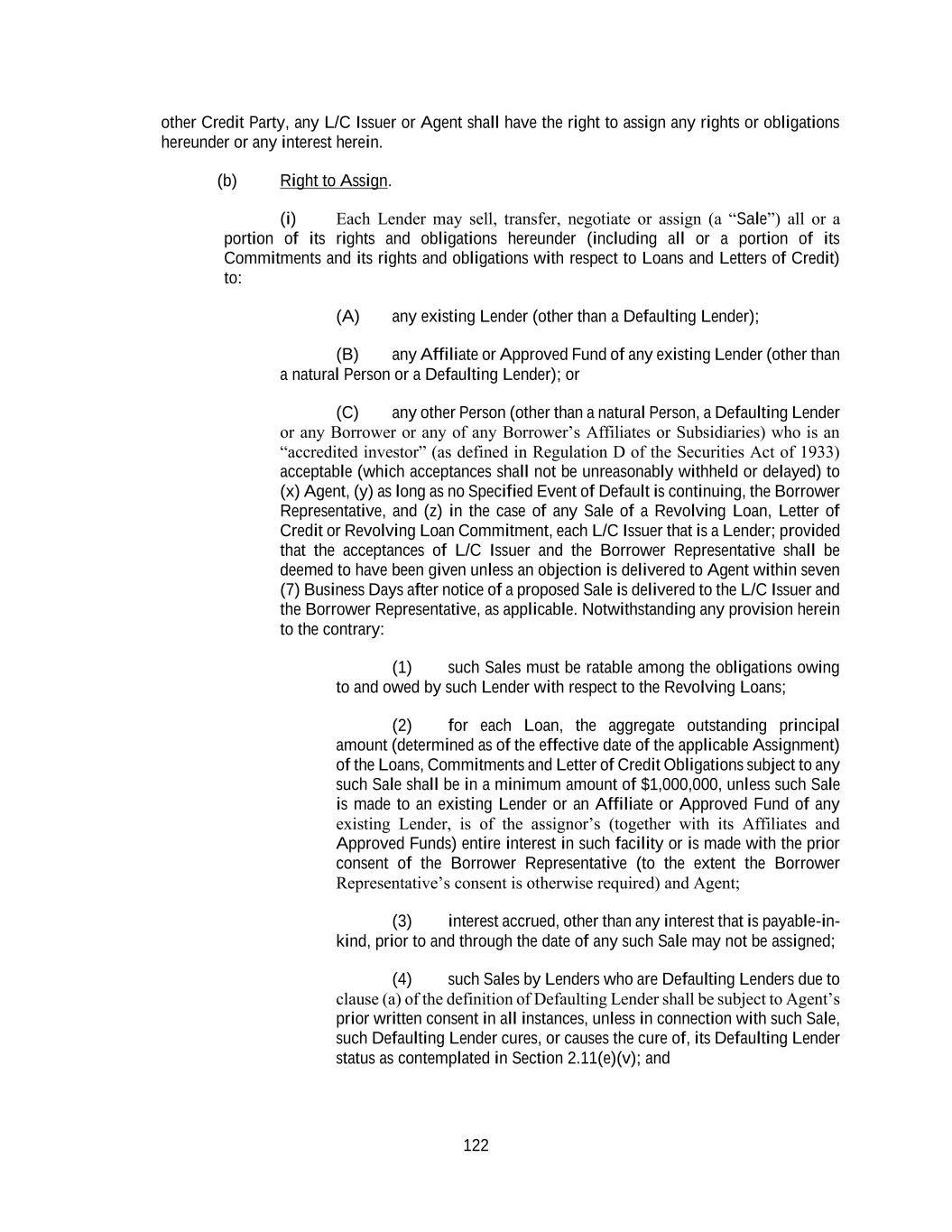 122 other Credit Party, any L/C Issuer or Agent shall have the right to assign any rights or obligations hereunder or any interest herein. (b) Right to Assign. (i) Each Lender may sell, transfer, negotiate or assign (a “Sale”) all or a portion of its rights and obligations hereunder (including all or a portion of its Commitments and its rights and obligations with respect to Loans and Letters of Credit) to: (A) any existing Lender (other than a Defaulting Lender); (B) any Affiliate or Approved Fund of any existing Lender (other than a natural Person or a Defaulting Lender); or (C) any other Person (other than a natural Person, a Defaulting Lender or any Borrower or any of any Borrower’s Affiliates or Subsidiaries) who is an “accredited investor” (as defined in Regulation D of the Securities Act of 1933) acceptable (which acceptances shall not be unreasonably withheld or delayed) to (x) Agent, (y) as long as no Specified Event of Default is continuing, the Borrower Representative, and (z) in the case of any Sale of a Revolving Loan, Letter of Credit or Revolving Loan Commitment, each L/C Issuer that is a Lender; provided that the acceptances of L/C Issuer and the Borrower Representative shall be deemed to have been given unless an objection is delivered to Agent within seven (7) Business Days after notice of a proposed Sale is delivered to the L/C Issuer and the Borrower Representative, as applicable. Notwithstanding any provision herein to the contrary: (1) such Sales must be ratable among the obligations owing to and owed by such Lender with respect to the Revolving Loans; (2) for each Loan, the aggregate outstanding principal amount (determined as of the effective date of the applicable Assignment) of the Loans, Commitments and Letter of Credit Obligations subject to any such Sale shall be in a minimum amount of $1,000,000, unless such Sale is made to an existing Lender or an Affiliate or Approved Fund of any existing Lender, is of the assignor’s (together with its Affiliates and Approved Funds) entire interest in such facility or is made with the prior consent of the Borrower Representative (to the extent the Borrower Representative’s consent is otherwise required) and Agent; (3) interest accrued, other than any interest that is payable-in- kind, prior to and through the date of any such Sale may not be assigned; (4) such Sales by Lenders who are Defaulting Lenders due to clause (a) of the definition of Defaulting Lender shall be subject to Agent’s prior written consent in all instances, unless in connection with such Sale, such Defaulting Lender cures, or causes the cure of, its Defaulting Lender status as contemplated in Section 2.11(e)(v); and