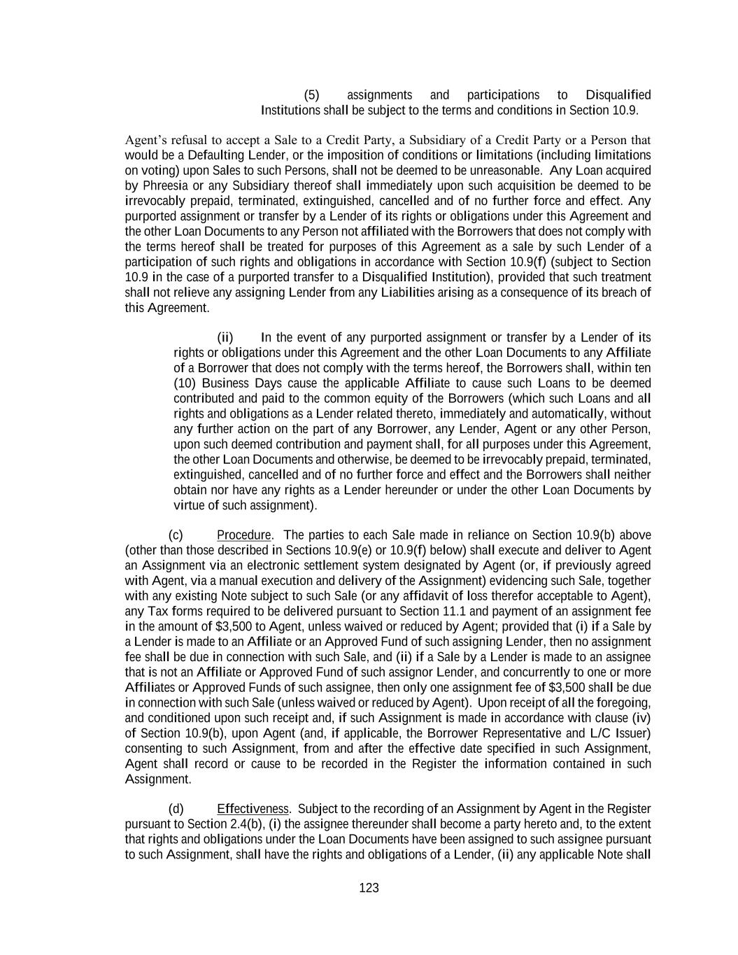123 (5) assignments and participations to Disqualified Institutions shall be subject to the terms and conditions in Section 10.9. Agent’s refusal to accept a Sale to a Credit Party, a Subsidiary of a Credit Party or a Person that would be a Defaulting Lender, or the imposition of conditions or limitations (including limitations on voting) upon Sales to such Persons, shall not be deemed to be unreasonable. Any Loan acquired by Phreesia or any Subsidiary thereof shall immediately upon such acquisition be deemed to be irrevocably prepaid, terminated, extinguished, cancelled and of no further force and effect. Any purported assignment or transfer by a Lender of its rights or obligations under this Agreement and the other Loan Documents to any Person not affiliated with the Borrowers that does not comply with the terms hereof shall be treated for purposes of this Agreement as a sale by such Lender of a participation of such rights and obligations in accordance with Section 10.9(f) (subject to Section 10.9 in the case of a purported transfer to a Disqualified Institution), provided that such treatment shall not relieve any assigning Lender from any Liabilities arising as a consequence of its breach of this Agreement. (ii) In the event of any purported assignment or transfer by a Lender of its rights or obligations under this Agreement and the other Loan Documents to any Affiliate of a Borrower that does not comply with the terms hereof, the Borrowers shall, within ten (10) Business Days cause the applicable Affiliate to cause such Loans to be deemed contributed and paid to the common equity of the Borrowers (which such Loans and all rights and obligations as a Lender related thereto, immediately and automatically, without any further action on the part of any Borrower, any Lender, Agent or any other Person, upon such deemed contribution and payment shall, for all purposes under this Agreement, the other Loan Documents and otherwise, be deemed to be irrevocably prepaid, terminated, extinguished, cancelled and of no further force and effect and the Borrowers shall neither obtain nor have any rights as a Lender hereunder or under the other Loan Documents by virtue of such assignment). (c) Procedure. The parties to each Sale made in reliance on Section 10.9(b) above (other than those described in Sections 10.9(e) or 10.9(f) below) shall execute and deliver to Agent an Assignment via an electronic settlement system designated by Agent (or, if previously agreed with Agent, via a manual execution and delivery of the Assignment) evidencing such Sale, together with any existing Note subject to such Sale (or any affidavit of loss therefor acceptable to Agent), any Tax forms required to be delivered pursuant to Section 11.1 and payment of an assignment fee in the amount of $3,500 to Agent, unless waived or reduced by Agent; provided that (i) if a Sale by a Lender is made to an Affiliate or an Approved Fund of such assigning Lender, then no assignment fee shall be due in connection with such Sale, and (ii) if a Sale by a Lender is made to an assignee that is not an Affiliate or Approved Fund of such assignor Lender, and concurrently to one or more Affiliates or Approved Funds of such assignee, then only one assignment fee of $3,500 shall be due in connection with such Sale (unless waived or reduced by Agent). Upon receipt of all the foregoing, and conditioned upon such receipt and, if such Assignment is made in accordance with clause (iv) of Section 10.9(b), upon Agent (and, if applicable, the Borrower Representative and L/C Issuer) consenting to such Assignment, from and after the effective date specified in such Assignment, Agent shall record or cause to be recorded in the Register the information contained in such Assignment. (d) Effectiveness. Subject to the recording of an Assignment by Agent in the Register pursuant to Section 2.4(b), (i) the assignee thereunder shall become a party hereto and, to the extent that rights and obligations under the Loan Documents have been assigned to such assignee pursuant to such Assignment, shall have the rights and obligations of a Lender, (ii) any applicable Note shall