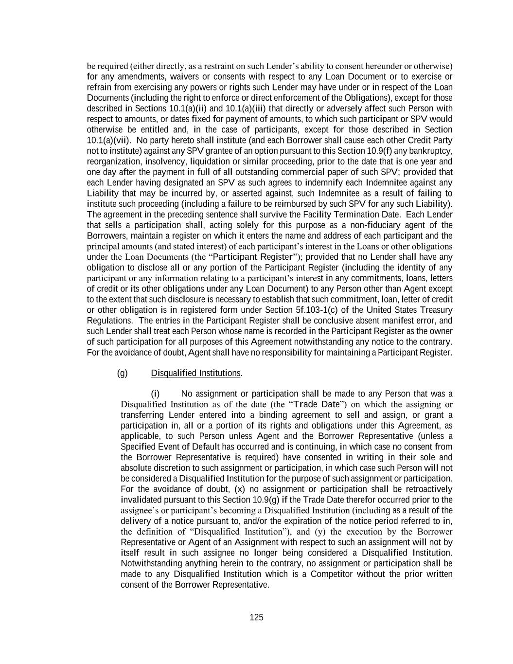 125 be required (either directly, as a restraint on such Lender’s ability to consent hereunder or otherwise) for any amendments, waivers or consents with respect to any Loan Document or to exercise or refrain from exercising any powers or rights such Lender may have under or in respect of the Loan Documents (including the right to enforce or direct enforcement of the Obligations), except for those described in Sections 10.1(a)(ii) and 10.1(a)(iii) that directly or adversely affect such Person with respect to amounts, or dates fixed for payment of amounts, to which such participant or SPV would otherwise be entitled and, in the case of participants, except for those described in Section 10.1(a)(vii). No party hereto shall institute (and each Borrower shall cause each other Credit Party not to institute) against any SPV grantee of an option pursuant to this Section 10.9(f) any bankruptcy, reorganization, insolvency, liquidation or similar proceeding, prior to the date that is one year and one day after the payment in full of all outstanding commercial paper of such SPV; provided that each Lender having designated an SPV as such agrees to indemnify each Indemnitee against any Liability that may be incurred by, or asserted against, such Indemnitee as a result of failing to institute such proceeding (including a failure to be reimbursed by such SPV for any such Liability). The agreement in the preceding sentence shall survive the Facility Termination Date. Each Lender that sells a participation shall, acting solely for this purpose as a non-fiduciary agent of the Borrowers, maintain a register on which it enters the name and address of each participant and the principal amounts (and stated interest) of each participant’s interest in the Loans or other obligations under the Loan Documents (the “Participant Register”); provided that no Lender shall have any obligation to disclose all or any portion of the Participant Register (including the identity of any participant or any information relating to a participant’s interest in any commitments, loans, letters of credit or its other obligations under any Loan Document) to any Person other than Agent except to the extent that such disclosure is necessary to establish that such commitment, loan, letter of credit or other obligation is in registered form under Section 5f.103-1(c) of the United States Treasury Regulations. The entries in the Participant Register shall be conclusive absent manifest error, and such Lender shall treat each Person whose name is recorded in the Participant Register as the owner of such participation for all purposes of this Agreement notwithstanding any notice to the contrary. For the avoidance of doubt, Agent shall have no responsibility for maintaining a Participant Register. (g) Disqualified Institutions. (i) No assignment or participation shall be made to any Person that was a Disqualified Institution as of the date (the “Trade Date”) on which the assigning or transferring Lender entered into a binding agreement to sell and assign, or grant a participation in, all or a portion of its rights and obligations under this Agreement, as applicable, to such Person unless Agent and the Borrower Representative (unless a Specified Event of Default has occurred and is continuing, in which case no consent from the Borrower Representative is required) have consented in writing in their sole and absolute discretion to such assignment or participation, in which case such Person will not be considered a Disqualified Institution for the purpose of such assignment or participation. For the avoidance of doubt, (x) no assignment or participation shall be retroactively invalidated pursuant to this Section 10.9(g) if the Trade Date therefor occurred prior to the assignee’s or participant’s becoming a Disqualified Institution (including as a result of the delivery of a notice pursuant to, and/or the expiration of the notice period referred to in, the definition of “Disqualified Institution”), and (y) the execution by the Borrower Representative or Agent of an Assignment with respect to such an assignment will not by itself result in such assignee no longer being considered a Disqualified Institution. Notwithstanding anything herein to the contrary, no assignment or participation shall be made to any Disqualified Institution which is a Competitor without the prior written consent of the Borrower Representative.