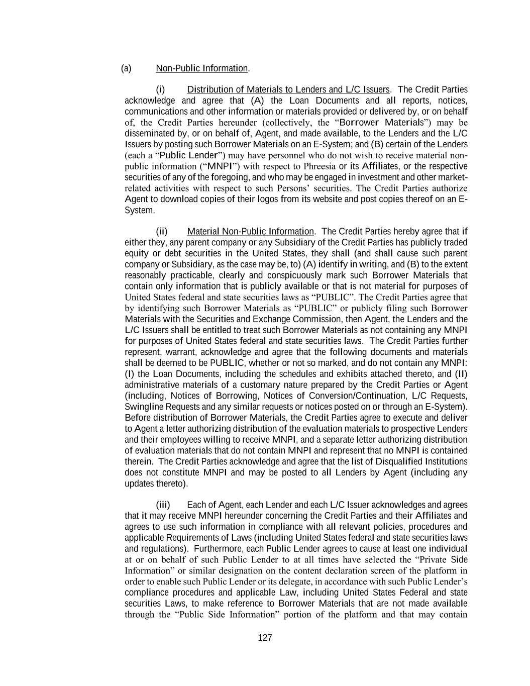 127 (a) Non-Public Information. (i) Distribution of Materials to Lenders and L/C Issuers. The Credit Parties acknowledge and agree that (A) the Loan Documents and all reports, notices, communications and other information or materials provided or delivered by, or on behalf of, the Credit Parties hereunder (collectively, the “Borrower Materials”) may be disseminated by, or on behalf of, Agent, and made available, to the Lenders and the L/C Issuers by posting such Borrower Materials on an E-System; and (B) certain of the Lenders (each a “Public Lender”) may have personnel who do not wish to receive material non- public information (“MNPI”) with respect to Phreesia or its Affiliates, or the respective securities of any of the foregoing, and who may be engaged in investment and other market- related activities with respect to such Persons’ securities. The Credit Parties authorize Agent to download copies of their logos from its website and post copies thereof on an E- System. (ii) Material Non-Public Information. The Credit Parties hereby agree that if either they, any parent company or any Subsidiary of the Credit Parties has publicly traded equity or debt securities in the United States, they shall (and shall cause such parent company or Subsidiary, as the case may be, to) (A) identify in writing, and (B) to the extent reasonably practicable, clearly and conspicuously mark such Borrower Materials that contain only information that is publicly available or that is not material for purposes of United States federal and state securities laws as “PUBLIC”. The Credit Parties agree that by identifying such Borrower Materials as “PUBLIC” or publicly filing such Borrower Materials with the Securities and Exchange Commission, then Agent, the Lenders and the L/C Issuers shall be entitled to treat such Borrower Materials as not containing any MNPI for purposes of United States federal and state securities laws. The Credit Parties further represent, warrant, acknowledge and agree that the following documents and materials shall be deemed to be PUBLIC, whether or not so marked, and do not contain any MNPI: (I) the Loan Documents, including the schedules and exhibits attached thereto, and (II) administrative materials of a customary nature prepared by the Credit Parties or Agent (including, Notices of Borrowing, Notices of Conversion/Continuation, L/C Requests, Swingline Requests and any similar requests or notices posted on or through an E-System). Before distribution of Borrower Materials, the Credit Parties agree to execute and deliver to Agent a letter authorizing distribution of the evaluation materials to prospective Lenders and their employees willing to receive MNPI, and a separate letter authorizing distribution of evaluation materials that do not contain MNPI and represent that no MNPI is contained therein. The Credit Parties acknowledge and agree that the list of Disqualified Institutions does not constitute MNPI and may be posted to all Lenders by Agent (including any updates thereto). (iii) Each of Agent, each Lender and each L/C Issuer acknowledges and agrees that it may receive MNPI hereunder concerning the Credit Parties and their Affiliates and agrees to use such information in compliance with all relevant policies, procedures and applicable Requirements of Laws (including United States federal and state securities laws and regulations). Furthermore, each Public Lender agrees to cause at least one individual at or on behalf of such Public Lender to at all times have selected the “Private Side Information” or similar designation on the content declaration screen of the platform in order to enable such Public Lender or its delegate, in accordance with such Public Lender’s compliance procedures and applicable Law, including United States Federal and state securities Laws, to make reference to Borrower Materials that are not made available through the “Public Side Information” portion of the platform and that may contain