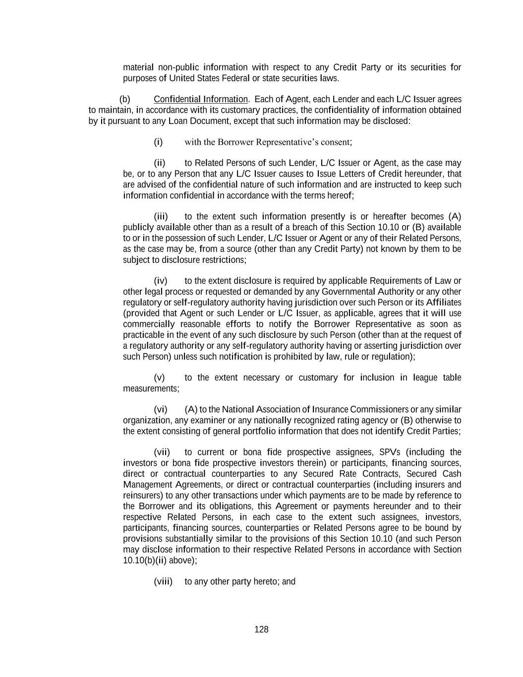 128 material non-public information with respect to any Credit Party or its securities for purposes of United States Federal or state securities laws. (b) Confidential Information. Each of Agent, each Lender and each L/C Issuer agrees to maintain, in accordance with its customary practices, the confidentiality of information obtained by it pursuant to any Loan Document, except that such information may be disclosed: (i) with the Borrower Representative’s consent; (ii) to Related Persons of such Lender, L/C Issuer or Agent, as the case may be, or to any Person that any L/C Issuer causes to Issue Letters of Credit hereunder, that are advised of the confidential nature of such information and are instructed to keep such information confidential in accordance with the terms hereof; (iii) to the extent such information presently is or hereafter becomes (A) publicly available other than as a result of a breach of this Section 10.10 or (B) available to or in the possession of such Lender, L/C Issuer or Agent or any of their Related Persons, as the case may be, from a source (other than any Credit Party) not known by them to be subject to disclosure restrictions; (iv) to the extent disclosure is required by applicable Requirements of Law or other legal process or requested or demanded by any Governmental Authority or any other regulatory or self-regulatory authority having jurisdiction over such Person or its Affiliates (provided that Agent or such Lender or L/C Issuer, as applicable, agrees that it will use commercially reasonable efforts to notify the Borrower Representative as soon as practicable in the event of any such disclosure by such Person (other than at the request of a regulatory authority or any self-regulatory authority having or asserting jurisdiction over such Person) unless such notification is prohibited by law, rule or regulation); (v) to the extent necessary or customary for inclusion in league table measurements; (vi) (A) to the National Association of Insurance Commissioners or any similar organization, any examiner or any nationally recognized rating agency or (B) otherwise to the extent consisting of general portfolio information that does not identify Credit Parties; (vii) to current or bona fide prospective assignees, SPVs (including the investors or bona fide prospective investors therein) or participants, financing sources, direct or contractual counterparties to any Secured Rate Contracts, Secured Cash Management Agreements, or direct or contractual counterparties (including insurers and reinsurers) to any other transactions under which payments are to be made by reference to the Borrower and its obligations, this Agreement or payments hereunder and to their respective Related Persons, in each case to the extent such assignees, investors, participants, financing sources, counterparties or Related Persons agree to be bound by provisions substantially similar to the provisions of this Section 10.10 (and such Person may disclose information to their respective Related Persons in accordance with Section 10.10(b)(ii) above); (viii) to any other party hereto; and