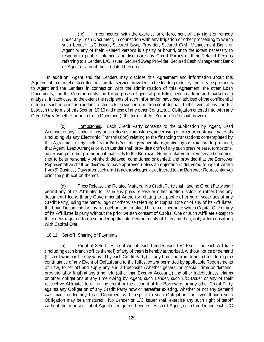129 (ix) in connection with the exercise or enforcement of any right or remedy under any Loan Document, in connection with any litigation or other proceeding to which such Lender, L/C Issuer, Secured Swap Provider, Secured Cash Management Bank or Agent or any of their Related Persons is a party or bound, or to the extent necessary to respond to public statements or disclosures by Credit Parties or their Related Persons referring to a Lender, L/C Issuer, Secured Swap Provider, Secured Cash Management Bank or Agent or any of their Related Persons. In addition, Agent and the Lenders may disclose this Agreement and information about this Agreement to market data collectors, similar service providers to the lending industry and service providers to Agent and the Lenders in connection with the administration of this Agreement, the other Loan Documents, and the Commitments and for purposes of general portfolio, benchmarking and market data analysis, in each case, to the extent the recipients of such information have been advised of the confidential nature of such information and instructed to keep such information confidential. In the event of any conflict between the terms of this Section 10.10 and those of any other Contractual Obligation entered into with any Credit Party (whether or not a Loan Document), the terms of this Section 10.10 shall govern. (c) Tombstones. Each Credit Party consents to the publication by Agent, Lead Arranger or any Lender of any press releases, tombstones, advertising or other promotional materials (including via any Electronic Transmission) relating to the financing transactions contemplated by this Agreement using such Credit Party’s name, product photographs, logo or trademark; provided, that Agent, Lead Arranger or such Lender shall provide a draft of any such press release, tombstone, advertising or other promotional materials to the Borrower Representative for review and comment (not to be unreasonably withheld, delayed, conditioned or denied, and provided that the Borrower Representative shall be deemed to have approved unless an objection is delivered to Agent within five (5) Business Days after such draft is acknowledged as delivered to the Borrower Representative) prior the publication thereof. (d) Press Release and Related Matters. No Credit Party shall, and no Credit Party shall permit any of its Affiliates to, issue any press release or other public disclosure (other than any document filed with any Governmental Authority relating to a public offering of securities of any Credit Party) using the name, logo or otherwise referring to Capital One or of any of its Affiliates, the Loan Documents or any transaction contemplated herein or therein to which Capital One or any of its Affiliates is party without the prior written consent of Capital One or such Affiliate except to the extent required to do so under applicable Requirements of Law and then, only after consulting with Capital One. 10.11. Set-off; Sharing of Payments. (a) Right of Setoff. Each of Agent, each Lender, each L/C Issuer and each Affiliate (including each branch office thereof) of any of them is hereby authorized, without notice or demand (each of which is hereby waived by each Credit Party), at any time and from time to time during the continuance of any Event of Default and to the fullest extent permitted by applicable Requirements of Law, to set off and apply any and all deposits (whether general or special, time or demand, provisional or final) at any time held (other than Exempt Accounts) and other Indebtedness, claims or other obligations at any time owing by Agent, such Lender, such L/C Issuer or any of their respective Affiliates to or for the credit or the account of the Borrowers or any other Credit Party against any Obligation of any Credit Party now or hereafter existing, whether or not any demand was made under any Loan Document with respect to such Obligation and even though such Obligation may be unmatured. No Lender or L/C Issuer shall exercise any such right of setoff without the prior consent of Agent or Required Lenders. Each of Agent, each Lender and each L/C