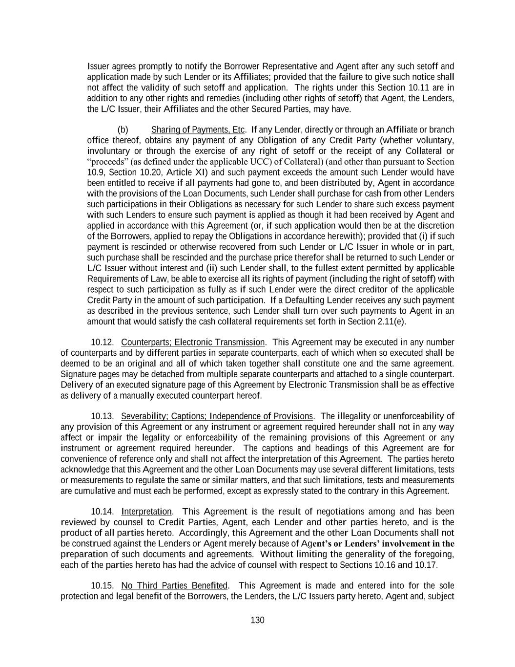 130 Issuer agrees promptly to notify the Borrower Representative and Agent after any such setoff and application made by such Lender or its Affiliates; provided that the failure to give such notice shall not affect the validity of such setoff and application. The rights under this Section 10.11 are in addition to any other rights and remedies (including other rights of setoff) that Agent, the Lenders, the L/C Issuer, their Affiliates and the other Secured Parties, may have. (b) Sharing of Payments, Etc. If any Lender, directly or through an Affiliate or branch office thereof, obtains any payment of any Obligation of any Credit Party (whether voluntary, involuntary or through the exercise of any right of setoff or the receipt of any Collateral or “proceeds” (as defined under the applicable UCC) of Collateral) (and other than pursuant to Section 10.9, Section 10.20, Article XI) and such payment exceeds the amount such Lender would have been entitled to receive if all payments had gone to, and been distributed by, Agent in accordance with the provisions of the Loan Documents, such Lender shall purchase for cash from other Lenders such participations in their Obligations as necessary for such Lender to share such excess payment with such Lenders to ensure such payment is applied as though it had been received by Agent and applied in accordance with this Agreement (or, if such application would then be at the discretion of the Borrowers, applied to repay the Obligations in accordance herewith); provided that (i) if such payment is rescinded or otherwise recovered from such Lender or L/C Issuer in whole or in part, such purchase shall be rescinded and the purchase price therefor shall be returned to such Lender or L/C Issuer without interest and (ii) such Lender shall, to the fullest extent permitted by applicable Requirements of Law, be able to exercise all its rights of payment (including the right of setoff) with respect to such participation as fully as if such Lender were the direct creditor of the applicable Credit Party in the amount of such participation. If a Defaulting Lender receives any such payment as described in the previous sentence, such Lender shall turn over such payments to Agent in an amount that would satisfy the cash collateral requirements set forth in Section 2.11(e). 10.12. Counterparts; Electronic Transmission. This Agreement may be executed in any number of counterparts and by different parties in separate counterparts, each of which when so executed shall be deemed to be an original and all of which taken together shall constitute one and the same agreement. Signature pages may be detached from multiple separate counterparts and attached to a single counterpart. Delivery of an executed signature page of this Agreement by Electronic Transmission shall be as effective as delivery of a manually executed counterpart hereof. 10.13. Severability; Captions; Independence of Provisions. The illegality or unenforceability of any provision of this Agreement or any instrument or agreement required hereunder shall not in any way affect or impair the legality or enforceability of the remaining provisions of this Agreement or any instrument or agreement required hereunder. The captions and headings of this Agreement are for convenience of reference only and shall not affect the interpretation of this Agreement. The parties hereto acknowledge that this Agreement and the other Loan Documents may use several different limitations, tests or measurements to regulate the same or similar matters, and that such limitations, tests and measurements are cumulative and must each be performed, except as expressly stated to the contrary in this Agreement. 10.14. Interpretation. This Agreement is the result of negotiations among and has been reviewed by counsel to Credit Parties, Agent, each Lender and other parties hereto, and is the product of all parties hereto. Accordingly, this Agreement and the other Loan Documents shall not be construed against the Lenders or Agent merely because of Agent’s or Lenders’ involvement in the preparation of such documents and agreements. Without limiting the generality of the foregoing, each of the parties hereto has had the advice of counsel with respect to Sections 10.16 and 10.17. 10.15. No Third Parties Benefited. This Agreement is made and entered into for the sole protection and legal benefit of the Borrowers, the Lenders, the L/C Issuers party hereto, Agent and, subject