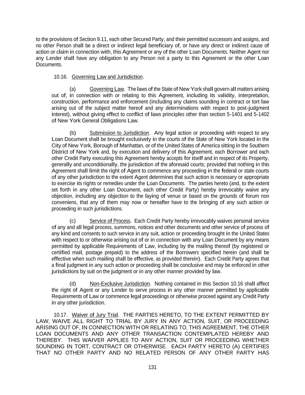 131 to the provisions of Section 9.11, each other Secured Party, and their permitted successors and assigns, and no other Person shall be a direct or indirect legal beneficiary of, or have any direct or indirect cause of action or claim in connection with, this Agreement or any of the other Loan Documents. Neither Agent nor any Lender shall have any obligation to any Person not a party to this Agreement or the other Loan Documents. 10.16. Governing Law and Jurisdiction. (a) Governing Law. The laws of the State of New York shall govern all matters arising out of, in connection with or relating to this Agreement, including its validity, interpretation, construction, performance and enforcement (including any claims sounding in contract or tort law arising out of the subject matter hereof and any determinations with respect to post-judgment interest), without giving effect to conflict of laws principles other than section 5-1401 and 5-1402 of New York General Obligations Law. (b) Submission to Jurisdiction. Any legal action or proceeding with respect to any Loan Document shall be brought exclusively in the courts of the State of New York located in the City of New York, Borough of Manhattan, or of the United States of America sitting in the Southern District of New York and, by execution and delivery of this Agreement, each Borrower and each other Credit Party executing this Agreement hereby accepts for itself and in respect of its Property, generally and unconditionally, the jurisdiction of the aforesaid courts; provided that nothing in this Agreement shall limit the right of Agent to commence any proceeding in the federal or state courts of any other jurisdiction to the extent Agent determines that such action is necessary or appropriate to exercise its rights or remedies under the Loan Documents. The parties hereto (and, to the extent set forth in any other Loan Document, each other Credit Party) hereby irrevocably waive any objection, including any objection to the laying of venue or based on the grounds of forum non conveniens, that any of them may now or hereafter have to the bringing of any such action or proceeding in such jurisdictions. (c) Service of Process. Each Credit Party hereby irrevocably waives personal service of any and all legal process, summons, notices and other documents and other service of process of any kind and consents to such service in any suit, action or proceeding brought in the United States with respect to or otherwise arising out of or in connection with any Loan Document by any means permitted by applicable Requirements of Law, including by the mailing thereof (by registered or certified mail, postage prepaid) to the address of the Borrowers specified herein (and shall be effective when such mailing shall be effective, as provided therein). Each Credit Party agrees that a final judgment in any such action or proceeding shall be conclusive and may be enforced in other jurisdictions by suit on the judgment or in any other manner provided by law. (d) Non-Exclusive Jurisdiction. Nothing contained in this Section 10.16 shall affect the right of Agent or any Lender to serve process in any other manner permitted by applicable Requirements of Law or commence legal proceedings or otherwise proceed against any Credit Party in any other jurisdiction. 10.17. Waiver of Jury Trial. THE PARTIES HERETO, TO THE EXTENT PERMITTED BY LAW, WAIVE ALL RIGHT TO TRIAL BY JURY IN ANY ACTION, SUIT, OR PROCEEDING ARISING OUT OF, IN CONNECTION WITH OR RELATING TO, THIS AGREEMENT, THE OTHER LOAN DOCUMENTS AND ANY OTHER TRANSACTION CONTEMPLATED HEREBY AND THEREBY. THIS WAIVER APPLIES TO ANY ACTION, SUIT OR PROCEEDING WHETHER SOUNDING IN TORT, CONTRACT OR OTHERWISE. EACH PARTY HERETO (A) CERTIFIES THAT NO OTHER PARTY AND NO RELATED PERSON OF ANY OTHER PARTY HAS