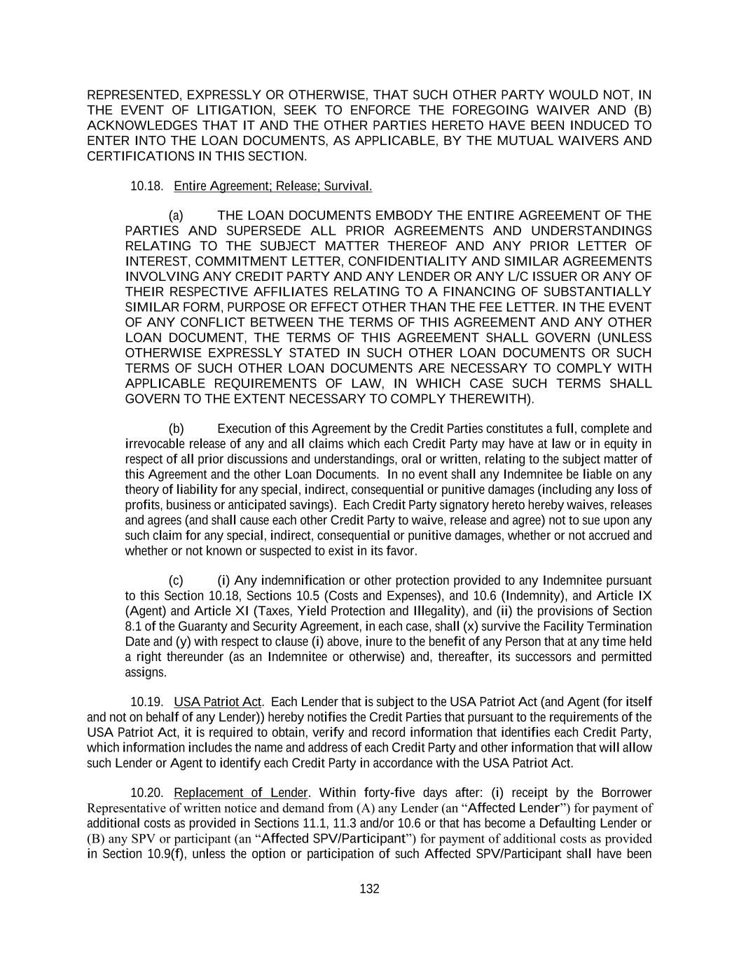132 REPRESENTED, EXPRESSLY OR OTHERWISE, THAT SUCH OTHER PARTY WOULD NOT, IN THE EVENT OF LITIGATION, SEEK TO ENFORCE THE FOREGOING WAIVER AND (B) ACKNOWLEDGES THAT IT AND THE OTHER PARTIES HERETO HAVE BEEN INDUCED TO ENTER INTO THE LOAN DOCUMENTS, AS APPLICABLE, BY THE MUTUAL WAIVERS AND CERTIFICATIONS IN THIS SECTION. 10.18. Entire Agreement; Release; Survival. (a) THE LOAN DOCUMENTS EMBODY THE ENTIRE AGREEMENT OF THE PARTIES AND SUPERSEDE ALL PRIOR AGREEMENTS AND UNDERSTANDINGS RELATING TO THE SUBJECT MATTER THEREOF AND ANY PRIOR LETTER OF INTEREST, COMMITMENT LETTER, CONFIDENTIALITY AND SIMILAR AGREEMENTS INVOLVING ANY CREDIT PARTY AND ANY LENDER OR ANY L/C ISSUER OR ANY OF THEIR RESPECTIVE AFFILIATES RELATING TO A FINANCING OF SUBSTANTIALLY SIMILAR FORM, PURPOSE OR EFFECT OTHER THAN THE FEE LETTER. IN THE EVENT OF ANY CONFLICT BETWEEN THE TERMS OF THIS AGREEMENT AND ANY OTHER LOAN DOCUMENT, THE TERMS OF THIS AGREEMENT SHALL GOVERN (UNLESS OTHERWISE EXPRESSLY STATED IN SUCH OTHER LOAN DOCUMENTS OR SUCH TERMS OF SUCH OTHER LOAN DOCUMENTS ARE NECESSARY TO COMPLY WITH APPLICABLE REQUIREMENTS OF LAW, IN WHICH CASE SUCH TERMS SHALL GOVERN TO THE EXTENT NECESSARY TO COMPLY THEREWITH). (b) Execution of this Agreement by the Credit Parties constitutes a full, complete and irrevocable release of any and all claims which each Credit Party may have at law or in equity in respect of all prior discussions and understandings, oral or written, relating to the subject matter of this Agreement and the other Loan Documents. In no event shall any Indemnitee be liable on any theory of liability for any special, indirect, consequential or punitive damages (including any loss of profits, business or anticipated savings). Each Credit Party signatory hereto hereby waives, releases and agrees (and shall cause each other Credit Party to waive, release and agree) not to sue upon any such claim for any special, indirect, consequential or punitive damages, whether or not accrued and whether or not known or suspected to exist in its favor. (c) (i) Any indemnification or other protection provided to any Indemnitee pursuant to this Section 10.18, Sections 10.5 (Costs and Expenses), and 10.6 (Indemnity), and Article IX (Agent) and Article XI (Taxes, Yield Protection and Illegality), and (ii) the provisions of Section 8.1 of the Guaranty and Security Agreement, in each case, shall (x) survive the Facility Termination Date and (y) with respect to clause (i) above, inure to the benefit of any Person that at any time held a right thereunder (as an Indemnitee or otherwise) and, thereafter, its successors and permitted assigns. 10.19. USA Patriot Act. Each Lender that is subject to the USA Patriot Act (and Agent (for itself and not on behalf of any Lender)) hereby notifies the Credit Parties that pursuant to the requirements of the USA Patriot Act, it is required to obtain, verify and record information that identifies each Credit Party, which information includes the name and address of each Credit Party and other information that will allow such Lender or Agent to identify each Credit Party in accordance with the USA Patriot Act. 10.20. Replacement of Lender. Within forty-five days after: (i) receipt by the Borrower Representative of written notice and demand from (A) any Lender (an “Affected Lender”) for payment of additional costs as provided in Sections 11.1, 11.3 and/or 10.6 or that has become a Defaulting Lender or (B) any SPV or participant (an “Affected SPV/Participant”) for payment of additional costs as provided in Section 10.9(f), unless the option or participation of such Affected SPV/Participant shall have been