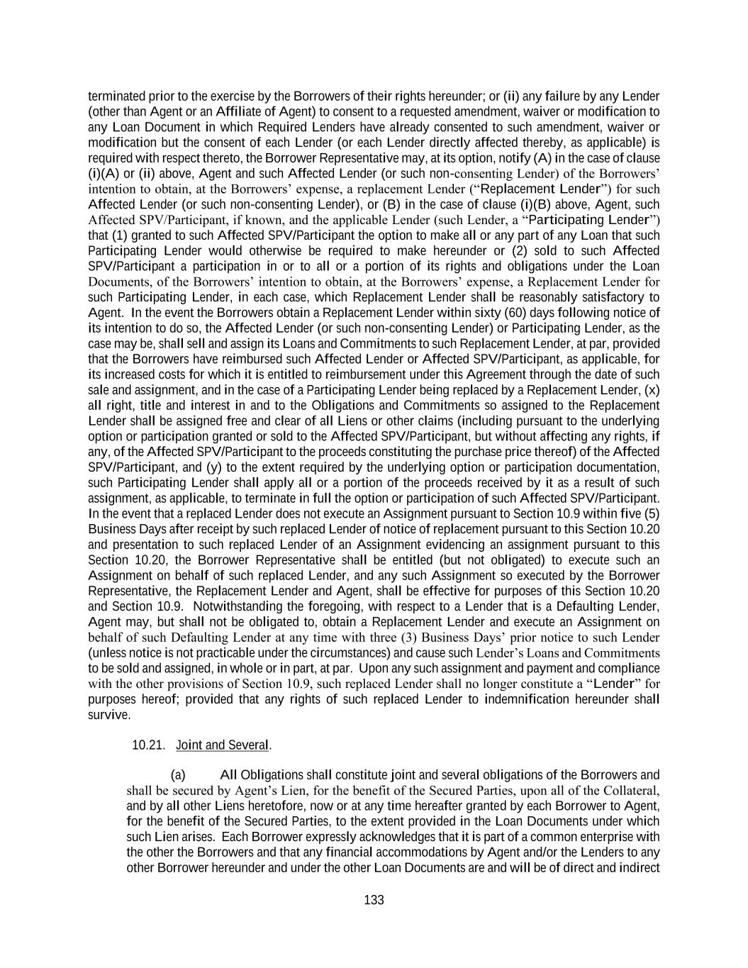 133 terminated prior to the exercise by the Borrowers of their rights hereunder; or (ii) any failure by any Lender (other than Agent or an Affiliate of Agent) to consent to a requested amendment, waiver or modification to any Loan Document in which Required Lenders have already consented to such amendment, waiver or modification but the consent of each Lender (or each Lender directly affected thereby, as applicable) is required with respect thereto, the Borrower Representative may, at its option, notify (A) in the case of clause (i)(A) or (ii) above, Agent and such Affected Lender (or such non-consenting Lender) of the Borrowers’ intention to obtain, at the Borrowers’ expense, a replacement Lender (“Replacement Lender”) for such Affected Lender (or such non-consenting Lender), or (B) in the case of clause (i)(B) above, Agent, such Affected SPV/Participant, if known, and the applicable Lender (such Lender, a “Participating Lender”) that (1) granted to such Affected SPV/Participant the option to make all or any part of any Loan that such Participating Lender would otherwise be required to make hereunder or (2) sold to such Affected SPV/Participant a participation in or to all or a portion of its rights and obligations under the Loan Documents, of the Borrowers’ intention to obtain, at the Borrowers’ expense, a Replacement Lender for such Participating Lender, in each case, which Replacement Lender shall be reasonably satisfactory to Agent. In the event the Borrowers obtain a Replacement Lender within sixty (60) days following notice of its intention to do so, the Affected Lender (or such non-consenting Lender) or Participating Lender, as the case may be, shall sell and assign its Loans and Commitments to such Replacement Lender, at par, provided that the Borrowers have reimbursed such Affected Lender or Affected SPV/Participant, as applicable, for its increased costs for which it is entitled to reimbursement under this Agreement through the date of such sale and assignment, and in the case of a Participating Lender being replaced by a Replacement Lender, (x) all right, title and interest in and to the Obligations and Commitments so assigned to the Replacement Lender shall be assigned free and clear of all Liens or other claims (including pursuant to the underlying option or participation granted or sold to the Affected SPV/Participant, but without affecting any rights, if any, of the Affected SPV/Participant to the proceeds constituting the purchase price thereof) of the Affected SPV/Participant, and (y) to the extent required by the underlying option or participation documentation, such Participating Lender shall apply all or a portion of the proceeds received by it as a result of such assignment, as applicable, to terminate in full the option or participation of such Affected SPV/Participant. In the event that a replaced Lender does not execute an Assignment pursuant to Section 10.9 within five (5) Business Days after receipt by such replaced Lender of notice of replacement pursuant to this Section 10.20 and presentation to such replaced Lender of an Assignment evidencing an assignment pursuant to this Section 10.20, the Borrower Representative shall be entitled (but not obligated) to execute such an Assignment on behalf of such replaced Lender, and any such Assignment so executed by the Borrower Representative, the Replacement Lender and Agent, shall be effective for purposes of this Section 10.20 and Section 10.9. Notwithstanding the foregoing, with respect to a Lender that is a Defaulting Lender, Agent may, but shall not be obligated to, obtain a Replacement Lender and execute an Assignment on behalf of such Defaulting Lender at any time with three (3) Business Days’ prior notice to such Lender (unless notice is not practicable under the circumstances) and cause such Lender’s Loans and Commitments to be sold and assigned, in whole or in part, at par. Upon any such assignment and payment and compliance with the other provisions of Section 10.9, such replaced Lender shall no longer constitute a “Lender” for purposes hereof; provided that any rights of such replaced Lender to indemnification hereunder shall survive. 10.21. Joint and Several. (a) All Obligations shall constitute joint and several obligations of the Borrowers and shall be secured by Agent’s Lien, for the benefit of the Secured Parties, upon all of the Collateral, and by all other Liens heretofore, now or at any time hereafter granted by each Borrower to Agent, for the benefit of the Secured Parties, to the extent provided in the Loan Documents under which such Lien arises. Each Borrower expressly acknowledges that it is part of a common enterprise with the other the Borrowers and that any financial accommodations by Agent and/or the Lenders to any other Borrower hereunder and under the other Loan Documents are and will be of direct and indirect