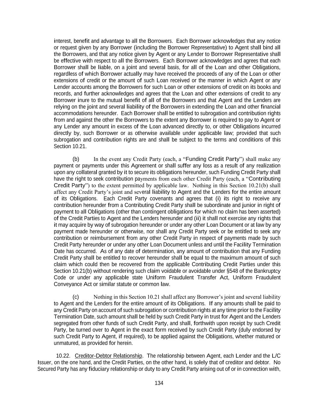 134 interest, benefit and advantage to all the Borrowers. Each Borrower acknowledges that any notice or request given by any Borrower (including the Borrower Representative) to Agent shall bind all the Borrowers, and that any notice given by Agent or any Lender to Borrower Representative shall be effective with respect to all the Borrowers. Each Borrower acknowledges and agrees that each Borrower shall be liable, on a joint and several basis, for all of the Loan and other Obligations, regardless of which Borrower actually may have received the proceeds of any of the Loan or other extensions of credit or the amount of such Loan received or the manner in which Agent or any Lender accounts among the Borrowers for such Loan or other extensions of credit on its books and records, and further acknowledges and agrees that the Loan and other extensions of credit to any Borrower inure to the mutual benefit of all of the Borrowers and that Agent and the Lenders are relying on the joint and several liability of the Borrowers in extending the Loan and other financial accommodations hereunder. Each Borrower shall be entitled to subrogation and contribution rights from and against the other the Borrowers to the extent any Borrower is required to pay to Agent or any Lender any amount in excess of the Loan advanced directly to, or other Obligations incurred directly by, such Borrower or as otherwise available under applicable law; provided that such subrogation and contribution rights are and shall be subject to the terms and conditions of this Section 10.21. (b) In the event any Credit Party (each, a “Funding Credit Party”) shall make any payment or payments under this Agreement or shall suffer any loss as a result of any realization upon any collateral granted by it to secure its obligations hereunder, such Funding Credit Party shall have the right to seek contribution payments from each other Credit Party (each, a “Contributing Credit Party”) to the extent permitted by applicable law. Nothing in this Section 10.21(b) shall affect any Credit Party’s joint and several liability to Agent and the Lenders for the entire amount of its Obligations. Each Credit Party covenants and agrees that (i) its right to receive any contribution hereunder from a Contributing Credit Party shall be subordinate and junior in right of payment to all Obligations (other than contingent obligations for which no claim has been asserted) of the Credit Parties to Agent and the Lenders hereunder and (ii) it shall not exercise any rights that it may acquire by way of subrogation hereunder or under any other Loan Document or at law by any payment made hereunder or otherwise, nor shall any Credit Party seek or be entitled to seek any contribution or reimbursement from any other Credit Party in respect of payments made by such Credit Party hereunder or under any other Loan Document unless and until the Facility Termination Date has occurred. As of any date of determination, any amount of contribution that any Funding Credit Party shall be entitled to recover hereunder shall be equal to the maximum amount of such claim which could then be recovered from the applicable Contributing Credit Parties under this Section 10.21(b) without rendering such claim voidable or avoidable under §548 of the Bankruptcy Code or under any applicable state Uniform Fraudulent Transfer Act, Uniform Fraudulent Conveyance Act or similar statute or common law. (c) Nothing in this Section 10.21 shall affect any Borrower’s joint and several liability to Agent and the Lenders for the entire amount of its Obligations. If any amounts shall be paid to any Credit Party on account of such subrogation or contribution rights at any time prior to the Facility Termination Date, such amount shall be held by such Credit Party in trust for Agent and the Lenders segregated from other funds of such Credit Party, and shall, forthwith upon receipt by such Credit Party, be turned over to Agent in the exact form received by such Credit Party (duly endorsed by such Credit Party to Agent, if required), to be applied against the Obligations, whether matured or unmatured, as provided for herein. 10.22. Creditor-Debtor Relationship. The relationship between Agent, each Lender and the L/C Issuer, on the one hand, and the Credit Parties, on the other hand, is solely that of creditor and debtor. No Secured Party has any fiduciary relationship or duty to any Credit Party arising out of or in connection with,