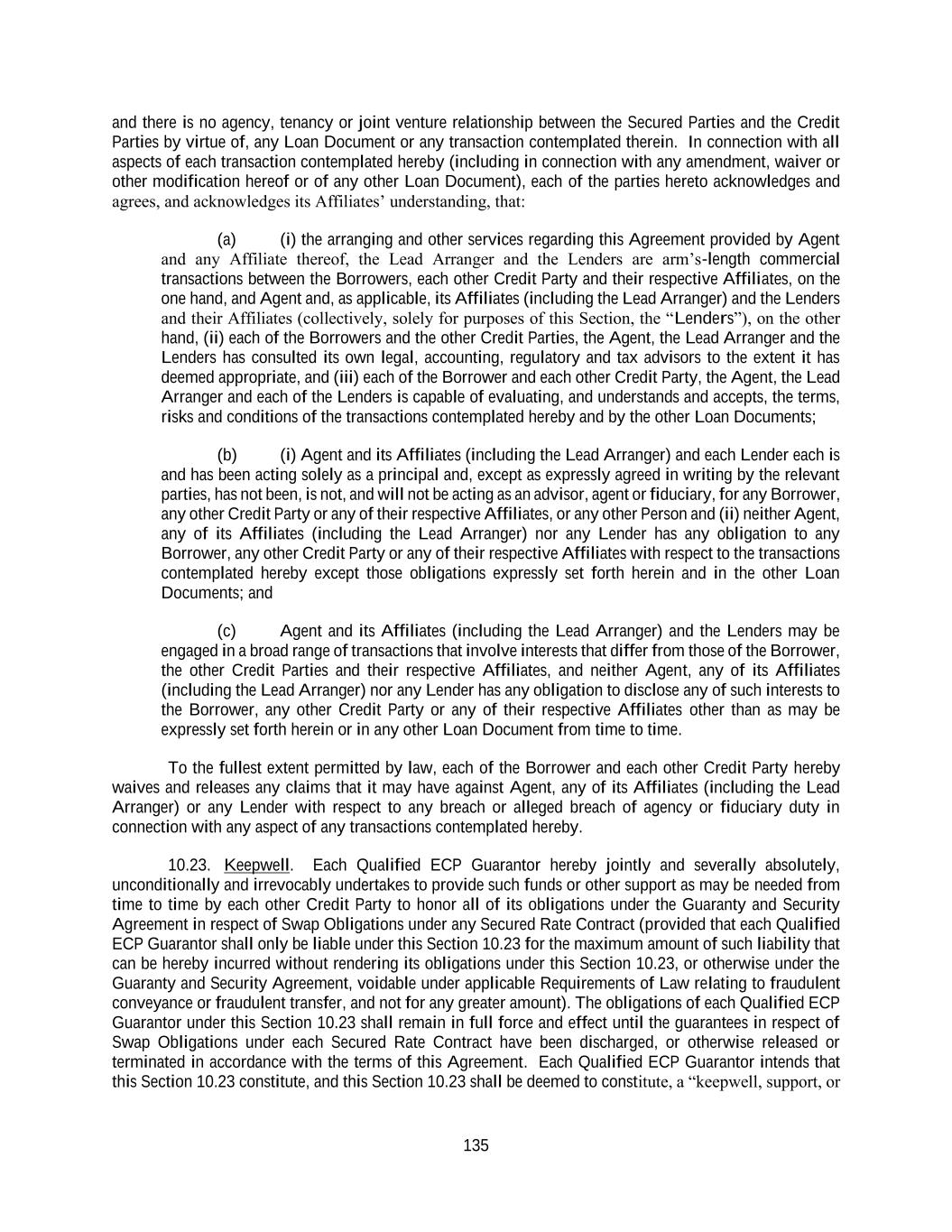 135 and there is no agency, tenancy or joint venture relationship between the Secured Parties and the Credit Parties by virtue of, any Loan Document or any transaction contemplated therein. In connection with all aspects of each transaction contemplated hereby (including in connection with any amendment, waiver or other modification hereof or of any other Loan Document), each of the parties hereto acknowledges and agrees, and acknowledges its Affiliates’ understanding, that: (a) (i) the arranging and other services regarding this Agreement provided by Agent and any Affiliate thereof, the Lead Arranger and the Lenders are arm’s-length commercial transactions between the Borrowers, each other Credit Party and their respective Affiliates, on the one hand, and Agent and, as applicable, its Affiliates (including the Lead Arranger) and the Lenders and their Affiliates (collectively, solely for purposes of this Section, the “Lenders”), on the other hand, (ii) each of the Borrowers and the other Credit Parties, the Agent, the Lead Arranger and the Lenders has consulted its own legal, accounting, regulatory and tax advisors to the extent it has deemed appropriate, and (iii) each of the Borrower and each other Credit Party, the Agent, the Lead Arranger and each of the Lenders is capable of evaluating, and understands and accepts, the terms, risks and conditions of the transactions contemplated hereby and by the other Loan Documents; (b) (i) Agent and its Affiliates (including the Lead Arranger) and each Lender each is and has been acting solely as a principal and, except as expressly agreed in writing by the relevant parties, has not been, is not, and will not be acting as an advisor, agent or fiduciary, for any Borrower, any other Credit Party or any of their respective Affiliates, or any other Person and (ii) neither Agent, any of its Affiliates (including the Lead Arranger) nor any Lender has any obligation to any Borrower, any other Credit Party or any of their respective Affiliates with respect to the transactions contemplated hereby except those obligations expressly set forth herein and in the other Loan Documents; and (c) Agent and its Affiliates (including the Lead Arranger) and the Lenders may be engaged in a broad range of transactions that involve interests that differ from those of the Borrower, the other Credit Parties and their respective Affiliates, and neither Agent, any of its Affiliates (including the Lead Arranger) nor any Lender has any obligation to disclose any of such interests to the Borrower, any other Credit Party or any of their respective Affiliates other than as may be expressly set forth herein or in any other Loan Document from time to time. To the fullest extent permitted by law, each of the Borrower and each other Credit Party hereby waives and releases any claims that it may have against Agent, any of its Affiliates (including the Lead Arranger) or any Lender with respect to any breach or alleged breach of agency or fiduciary duty in connection with any aspect of any transactions contemplated hereby. 10.23. Keepwell. Each Qualified ECP Guarantor hereby jointly and severally absolutely, unconditionally and irrevocably undertakes to provide such funds or other support as may be needed from time to time by each other Credit Party to honor all of its obligations under the Guaranty and Security Agreement in respect of Swap Obligations under any Secured Rate Contract (provided that each Qualified ECP Guarantor shall only be liable under this Section 10.23 for the maximum amount of such liability that can be hereby incurred without rendering its obligations under this Section 10.23, or otherwise under the Guaranty and Security Agreement, voidable under applicable Requirements of Law relating to fraudulent conveyance or fraudulent transfer, and not for any greater amount). The obligations of each Qualified ECP Guarantor under this Section 10.23 shall remain in full force and effect until the guarantees in respect of Swap Obligations under each Secured Rate Contract have been discharged, or otherwise released or terminated in accordance with the terms of this Agreement. Each Qualified ECP Guarantor intends that this Section 10.23 constitute, and this Section 10.23 shall be deemed to constitute, a “keepwell, support, or