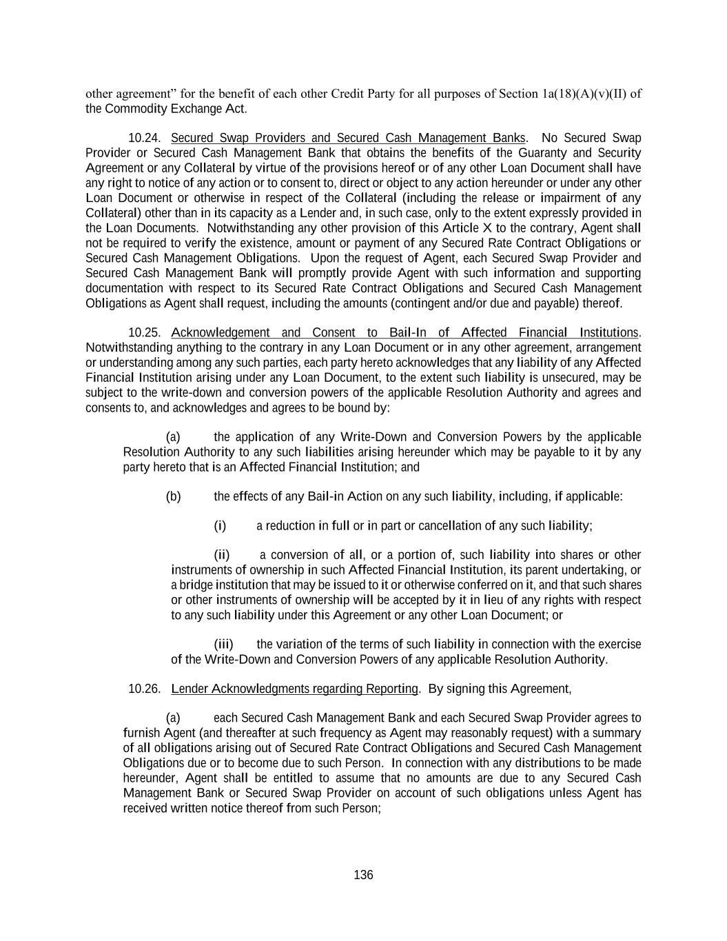 136 other agreement” for the benefit of each other Credit Party for all purposes of Section 1a(18)(A)(v)(II) of the Commodity Exchange Act. 10.24. Secured Swap Providers and Secured Cash Management Banks. No Secured Swap Provider or Secured Cash Management Bank that obtains the benefits of the Guaranty and Security Agreement or any Collateral by virtue of the provisions hereof or of any other Loan Document shall have any right to notice of any action or to consent to, direct or object to any action hereunder or under any other Loan Document or otherwise in respect of the Collateral (including the release or impairment of any Collateral) other than in its capacity as a Lender and, in such case, only to the extent expressly provided in the Loan Documents. Notwithstanding any other provision of this Article X to the contrary, Agent shall not be required to verify the existence, amount or payment of any Secured Rate Contract Obligations or Secured Cash Management Obligations. Upon the request of Agent, each Secured Swap Provider and Secured Cash Management Bank will promptly provide Agent with such information and supporting documentation with respect to its Secured Rate Contract Obligations and Secured Cash Management Obligations as Agent shall request, including the amounts (contingent and/or due and payable) thereof. 10.25. Acknowledgement and Consent to Bail-In of Affected Financial Institutions. Notwithstanding anything to the contrary in any Loan Document or in any other agreement, arrangement or understanding among any such parties, each party hereto acknowledges that any liability of any Affected Financial Institution arising under any Loan Document, to the extent such liability is unsecured, may be subject to the write-down and conversion powers of the applicable Resolution Authority and agrees and consents to, and acknowledges and agrees to be bound by: (a) the application of any Write-Down and Conversion Powers by the applicable Resolution Authority to any such liabilities arising hereunder which may be payable to it by any party hereto that is an Affected Financial Institution; and (b) the effects of any Bail-in Action on any such liability, including, if applicable: (i) a reduction in full or in part or cancellation of any such liability; (ii) a conversion of all, or a portion of, such liability into shares or other instruments of ownership in such Affected Financial Institution, its parent undertaking, or a bridge institution that may be issued to it or otherwise conferred on it, and that such shares or other instruments of ownership will be accepted by it in lieu of any rights with respect to any such liability under this Agreement or any other Loan Document; or (iii) the variation of the terms of such liability in connection with the exercise of the Write-Down and Conversion Powers of any applicable Resolution Authority. 10.26. Lender Acknowledgments regarding Reporting. By signing this Agreement, (a) each Secured Cash Management Bank and each Secured Swap Provider agrees to furnish Agent (and thereafter at such frequency as Agent may reasonably request) with a summary of all obligations arising out of Secured Rate Contract Obligations and Secured Cash Management Obligations due or to become due to such Person. In connection with any distributions to be made hereunder, Agent shall be entitled to assume that no amounts are due to any Secured Cash Management Bank or Secured Swap Provider on account of such obligations unless Agent has received written notice thereof from such Person;
