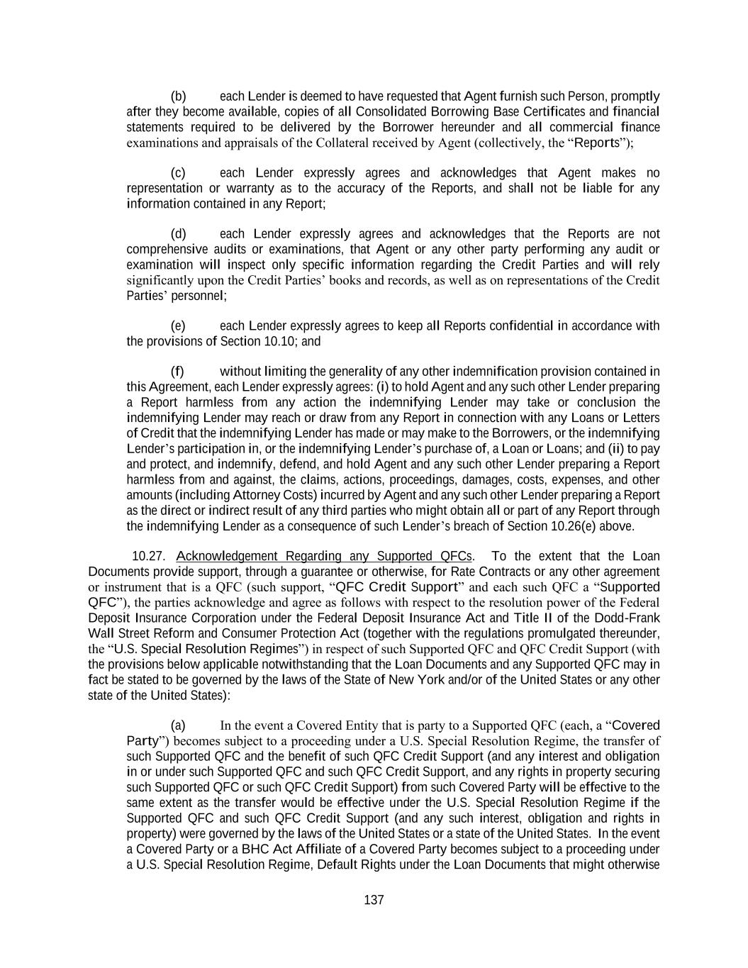 137 (b) each Lender is deemed to have requested that Agent furnish such Person, promptly after they become available, copies of all Consolidated Borrowing Base Certificates and financial statements required to be delivered by the Borrower hereunder and all commercial finance examinations and appraisals of the Collateral received by Agent (collectively, the “Reports”); (c) each Lender expressly agrees and acknowledges that Agent makes no representation or warranty as to the accuracy of the Reports, and shall not be liable for any information contained in any Report; (d) each Lender expressly agrees and acknowledges that the Reports are not comprehensive audits or examinations, that Agent or any other party performing any audit or examination will inspect only specific information regarding the Credit Parties and will rely significantly upon the Credit Parties’ books and records, as well as on representations of the Credit Parties’ personnel; (e) each Lender expressly agrees to keep all Reports confidential in accordance with the provisions of Section 10.10; and (f) without limiting the generality of any other indemnification provision contained in this Agreement, each Lender expressly agrees: (i) to hold Agent and any such other Lender preparing a Report harmless from any action the indemnifying Lender may take or conclusion the indemnifying Lender may reach or draw from any Report in connection with any Loans or Letters of Credit that the indemnifying Lender has made or may make to the Borrowers, or the indemnifying Lender’s participation in, or the indemnifying Lender’s purchase of, a Loan or Loans; and (ii) to pay and protect, and indemnify, defend, and hold Agent and any such other Lender preparing a Report harmless from and against, the claims, actions, proceedings, damages, costs, expenses, and other amounts (including Attorney Costs) incurred by Agent and any such other Lender preparing a Report as the direct or indirect result of any third parties who might obtain all or part of any Report through the indemnifying Lender as a consequence of such Lender’s breach of Section 10.26(e) above. 10.27. Acknowledgement Regarding any Supported QFCs. To the extent that the Loan Documents provide support, through a guarantee or otherwise, for Rate Contracts or any other agreement or instrument that is a QFC (such support, “QFC Credit Support” and each such QFC a “Supported QFC”), the parties acknowledge and agree as follows with respect to the resolution power of the Federal Deposit Insurance Corporation under the Federal Deposit Insurance Act and Title II of the Dodd-Frank Wall Street Reform and Consumer Protection Act (together with the regulations promulgated thereunder, the “U.S. Special Resolution Regimes”) in respect of such Supported QFC and QFC Credit Support (with the provisions below applicable notwithstanding that the Loan Documents and any Supported QFC may in fact be stated to be governed by the laws of the State of New York and/or of the United States or any other state of the United States): (a) In the event a Covered Entity that is party to a Supported QFC (each, a “Covered Party”) becomes subject to a proceeding under a U.S. Special Resolution Regime, the transfer of such Supported QFC and the benefit of such QFC Credit Support (and any interest and obligation in or under such Supported QFC and such QFC Credit Support, and any rights in property securing such Supported QFC or such QFC Credit Support) from such Covered Party will be effective to the same extent as the transfer would be effective under the U.S. Special Resolution Regime if the Supported QFC and such QFC Credit Support (and any such interest, obligation and rights in property) were governed by the laws of the United States or a state of the United States. In the event a Covered Party or a BHC Act Affiliate of a Covered Party becomes subject to a proceeding under a U.S. Special Resolution Regime, Default Rights under the Loan Documents that might otherwise