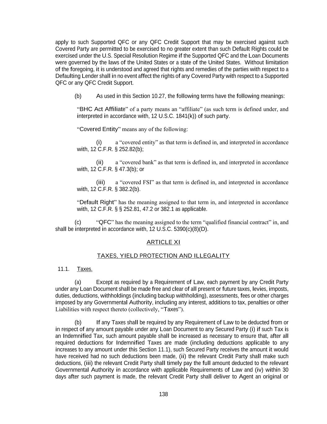 138 apply to such Supported QFC or any QFC Credit Support that may be exercised against such Covered Party are permitted to be exercised to no greater extent than such Default Rights could be exercised under the U.S. Special Resolution Regime if the Supported QFC and the Loan Documents were governed by the laws of the United States or a state of the United States. Without limitation of the foregoing, it is understood and agreed that rights and remedies of the parties with respect to a Defaulting Lender shall in no event affect the rights of any Covered Party with respect to a Supported QFC or any QFC Credit Support. (b) As used in this Section 10.27, the following terms have the following meanings: “BHC Act Affiliate” of a party means an “affiliate” (as such term is defined under, and interpreted in accordance with, 12 U.S.C. 1841(k)) of such party. “Covered Entity” means any of the following: (i) a “covered entity” as that term is defined in, and interpreted in accordance with, 12 C.F.R. § 252.82(b); (ii) a “covered bank” as that term is defined in, and interpreted in accordance with, 12 C.F.R. § 47.3(b); or (iii) a “covered FSI” as that term is defined in, and interpreted in accordance with, 12 C.F.R. § 382.2(b). “Default Right” has the meaning assigned to that term in, and interpreted in accordance with, 12 C.F.R. § § 252.81, 47.2 or 382.1 as applicable. (c) “QFC” has the meaning assigned to the term “qualified financial contract” in, and shall be interpreted in accordance with, 12 U.S.C. 5390(c)(8)(D). ARTICLE XI TAXES, YIELD PROTECTION AND ILLEGALITY 11.1. Taxes. (a) Except as required by a Requirement of Law, each payment by any Credit Party under any Loan Document shall be made free and clear of all present or future taxes, levies, imposts, duties, deductions, withholdings (including backup withholding), assessments, fees or other charges imposed by any Governmental Authority, including any interest, additions to tax, penalties or other Liabilities with respect thereto (collectively, “Taxes”). (b) If any Taxes shall be required by any Requirement of Law to be deducted from or in respect of any amount payable under any Loan Document to any Secured Party (i) if such Tax is an Indemnified Tax, such amount payable shall be increased as necessary to ensure that, after all required deductions for Indemnified Taxes are made (including deductions applicable to any increases to any amount under this Section 11.1), such Secured Party receives the amount it would have received had no such deductions been made, (ii) the relevant Credit Party shall make such deductions, (iii) the relevant Credit Party shall timely pay the full amount deducted to the relevant Governmental Authority in accordance with applicable Requirements of Law and (iv) within 30 days after such payment is made, the relevant Credit Party shall deliver to Agent an original or