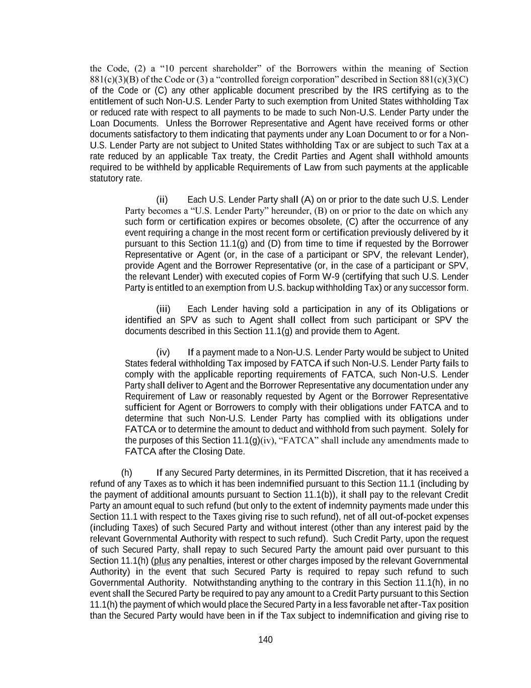 140 the Code, (2) a “10 percent shareholder” of the Borrowers within the meaning of Section 881(c)(3)(B) of the Code or (3) a “controlled foreign corporation” described in Section 881(c)(3)(C) of the Code or (C) any other applicable document prescribed by the IRS certifying as to the entitlement of such Non-U.S. Lender Party to such exemption from United States withholding Tax or reduced rate with respect to all payments to be made to such Non-U.S. Lender Party under the Loan Documents. Unless the Borrower Representative and Agent have received forms or other documents satisfactory to them indicating that payments under any Loan Document to or for a Non- U.S. Lender Party are not subject to United States withholding Tax or are subject to such Tax at a rate reduced by an applicable Tax treaty, the Credit Parties and Agent shall withhold amounts required to be withheld by applicable Requirements of Law from such payments at the applicable statutory rate. (ii) Each U.S. Lender Party shall (A) on or prior to the date such U.S. Lender Party becomes a “U.S. Lender Party” hereunder, (B) on or prior to the date on which any such form or certification expires or becomes obsolete, (C) after the occurrence of any event requiring a change in the most recent form or certification previously delivered by it pursuant to this Section 11.1(g) and (D) from time to time if requested by the Borrower Representative or Agent (or, in the case of a participant or SPV, the relevant Lender), provide Agent and the Borrower Representative (or, in the case of a participant or SPV, the relevant Lender) with executed copies of Form W-9 (certifying that such U.S. Lender Party is entitled to an exemption from U.S. backup withholding Tax) or any successor form. (iii) Each Lender having sold a participation in any of its Obligations or identified an SPV as such to Agent shall collect from such participant or SPV the documents described in this Section 11.1(g) and provide them to Agent. (iv) If a payment made to a Non-U.S. Lender Party would be subject to United States federal withholding Tax imposed by FATCA if such Non-U.S. Lender Party fails to comply with the applicable reporting requirements of FATCA, such Non-U.S. Lender Party shall deliver to Agent and the Borrower Representative any documentation under any Requirement of Law or reasonably requested by Agent or the Borrower Representative sufficient for Agent or Borrowers to comply with their obligations under FATCA and to determine that such Non-U.S. Lender Party has complied with its obligations under FATCA or to determine the amount to deduct and withhold from such payment. Solely for the purposes of this Section 11.1(g)(iv), “FATCA” shall include any amendments made to FATCA after the Closing Date. (h) If any Secured Party determines, in its Permitted Discretion, that it has received a refund of any Taxes as to which it has been indemnified pursuant to this Section 11.1 (including by the payment of additional amounts pursuant to Section 11.1(b)), it shall pay to the relevant Credit Party an amount equal to such refund (but only to the extent of indemnity payments made under this Section 11.1 with respect to the Taxes giving rise to such refund), net of all out-of-pocket expenses (including Taxes) of such Secured Party and without interest (other than any interest paid by the relevant Governmental Authority with respect to such refund). Such Credit Party, upon the request of such Secured Party, shall repay to such Secured Party the amount paid over pursuant to this Section 11.1(h) (plus any penalties, interest or other charges imposed by the relevant Governmental Authority) in the event that such Secured Party is required to repay such refund to such Governmental Authority. Notwithstanding anything to the contrary in this Section 11.1(h), in no event shall the Secured Party be required to pay any amount to a Credit Party pursuant to this Section 11.1(h) the payment of which would place the Secured Party in a less favorable net after-Tax position than the Secured Party would have been in if the Tax subject to indemnification and giving rise to