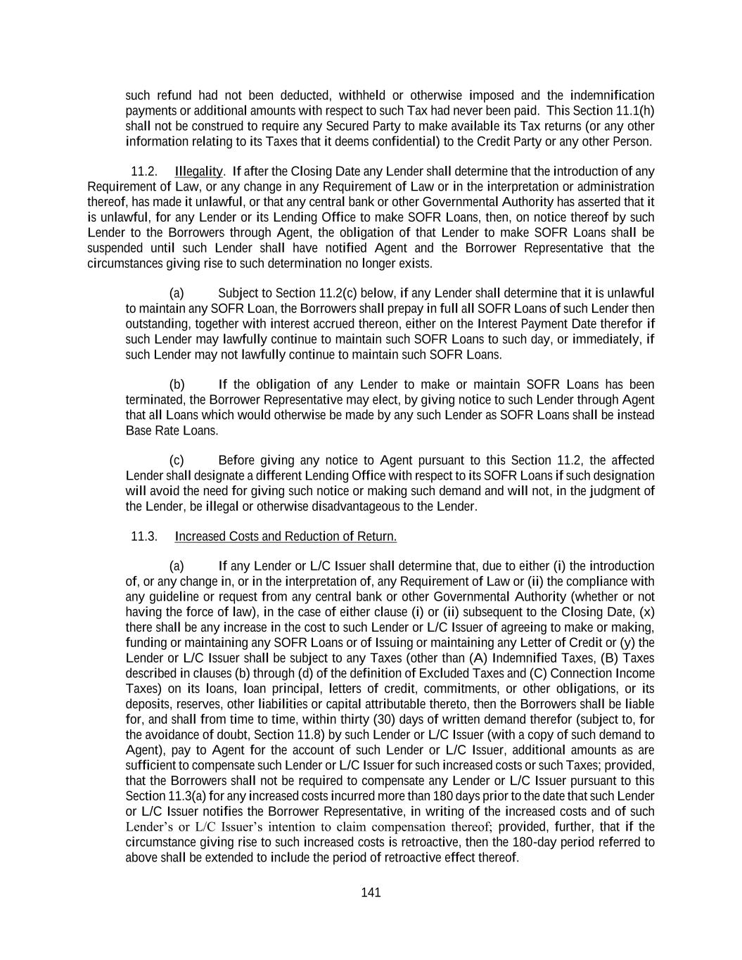 141 such refund had not been deducted, withheld or otherwise imposed and the indemnification payments or additional amounts with respect to such Tax had never been paid. This Section 11.1(h) shall not be construed to require any Secured Party to make available its Tax returns (or any other information relating to its Taxes that it deems confidential) to the Credit Party or any other Person. 11.2. Illegality. If after the Closing Date any Lender shall determine that the introduction of any Requirement of Law, or any change in any Requirement of Law or in the interpretation or administration thereof, has made it unlawful, or that any central bank or other Governmental Authority has asserted that it is unlawful, for any Lender or its Lending Office to make SOFR Loans, then, on notice thereof by such Lender to the Borrowers through Agent, the obligation of that Lender to make SOFR Loans shall be suspended until such Lender shall have notified Agent and the Borrower Representative that the circumstances giving rise to such determination no longer exists. (a) Subject to Section 11.2(c) below, if any Lender shall determine that it is unlawful to maintain any SOFR Loan, the Borrowers shall prepay in full all SOFR Loans of such Lender then outstanding, together with interest accrued thereon, either on the Interest Payment Date therefor if such Lender may lawfully continue to maintain such SOFR Loans to such day, or immediately, if such Lender may not lawfully continue to maintain such SOFR Loans. (b) If the obligation of any Lender to make or maintain SOFR Loans has been terminated, the Borrower Representative may elect, by giving notice to such Lender through Agent that all Loans which would otherwise be made by any such Lender as SOFR Loans shall be instead Base Rate Loans. (c) Before giving any notice to Agent pursuant to this Section 11.2, the affected Lender shall designate a different Lending Office with respect to its SOFR Loans if such designation will avoid the need for giving such notice or making such demand and will not, in the judgment of the Lender, be illegal or otherwise disadvantageous to the Lender. 11.3. Increased Costs and Reduction of Return. (a) If any Lender or L/C Issuer shall determine that, due to either (i) the introduction of, or any change in, or in the interpretation of, any Requirement of Law or (ii) the compliance with any guideline or request from any central bank or other Governmental Authority (whether or not having the force of law), in the case of either clause (i) or (ii) subsequent to the Closing Date, (x) there shall be any increase in the cost to such Lender or L/C Issuer of agreeing to make or making, funding or maintaining any SOFR Loans or of Issuing or maintaining any Letter of Credit or (y) the Lender or L/C Issuer shall be subject to any Taxes (other than (A) Indemnified Taxes, (B) Taxes described in clauses (b) through (d) of the definition of Excluded Taxes and (C) Connection Income Taxes) on its loans, loan principal, letters of credit, commitments, or other obligations, or its deposits, reserves, other liabilities or capital attributable thereto, then the Borrowers shall be liable for, and shall from time to time, within thirty (30) days of written demand therefor (subject to, for the avoidance of doubt, Section 11.8) by such Lender or L/C Issuer (with a copy of such demand to Agent), pay to Agent for the account of such Lender or L/C Issuer, additional amounts as are sufficient to compensate such Lender or L/C Issuer for such increased costs or such Taxes; provided, that the Borrowers shall not be required to compensate any Lender or L/C Issuer pursuant to this Section 11.3(a) for any increased costs incurred more than 180 days prior to the date that such Lender or L/C Issuer notifies the Borrower Representative, in writing of the increased costs and of such Lender’s or L/C Issuer’s intention to claim compensation thereof; provided, further, that if the circumstance giving rise to such increased costs is retroactive, then the 180-day period referred to above shall be extended to include the period of retroactive effect thereof.