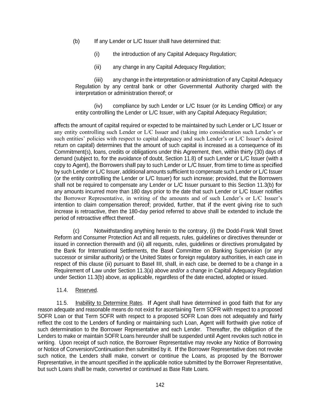 142 (b) If any Lender or L/C Issuer shall have determined that: (i) the introduction of any Capital Adequacy Regulation; (ii) any change in any Capital Adequacy Regulation; (iii) any change in the interpretation or administration of any Capital Adequacy Regulation by any central bank or other Governmental Authority charged with the interpretation or administration thereof; or (iv) compliance by such Lender or L/C Issuer (or its Lending Office) or any entity controlling the Lender or L/C Issuer, with any Capital Adequacy Regulation; affects the amount of capital required or expected to be maintained by such Lender or L/C Issuer or any entity controlling such Lender or L/C Issuer and (taking into consideration such Lender’s or such entities’ policies with respect to capital adequacy and such Lender’s or L/C Issuer’s desired return on capital) determines that the amount of such capital is increased as a consequence of its Commitment(s), loans, credits or obligations under this Agreement, then, within thirty (30) days of demand (subject to, for the avoidance of doubt, Section 11.8) of such Lender or L/C Issuer (with a copy to Agent), the Borrowers shall pay to such Lender or L/C Issuer, from time to time as specified by such Lender or L/C Issuer, additional amounts sufficient to compensate such Lender or L/C Issuer (or the entity controlling the Lender or L/C Issuer) for such increase; provided, that the Borrowers shall not be required to compensate any Lender or L/C Issuer pursuant to this Section 11.3(b) for any amounts incurred more than 180 days prior to the date that such Lender or L/C Issuer notifies the Borrower Representative, in writing of the amounts and of such Lender’s or L/C Issuer’s intention to claim compensation thereof; provided, further, that if the event giving rise to such increase is retroactive, then the 180-day period referred to above shall be extended to include the period of retroactive effect thereof. (c) Notwithstanding anything herein to the contrary, (i) the Dodd-Frank Wall Street Reform and Consumer Protection Act and all requests, rules, guidelines or directives thereunder or issued in connection therewith and (ii) all requests, rules, guidelines or directives promulgated by the Bank for International Settlements, the Basel Committee on Banking Supervision (or any successor or similar authority) or the United States or foreign regulatory authorities, in each case in respect of this clause (ii) pursuant to Basel III, shall, in each case, be deemed to be a change in a Requirement of Law under Section 11.3(a) above and/or a change in Capital Adequacy Regulation under Section 11.3(b) above, as applicable, regardless of the date enacted, adopted or issued. 11.4. Reserved. 11.5. Inability to Determine Rates. If Agent shall have determined in good faith that for any reason adequate and reasonable means do not exist for ascertaining Term SOFR with respect to a proposed SOFR Loan or that Term SOFR with respect to a proposed SOFR Loan does not adequately and fairly reflect the cost to the Lenders of funding or maintaining such Loan, Agent will forthwith give notice of such determination to the Borrower Representative and each Lender. Thereafter, the obligation of the Lenders to make or maintain SOFR Loans hereunder shall be suspended until Agent revokes such notice in writing. Upon receipt of such notice, the Borrower Representative may revoke any Notice of Borrowing or Notice of Conversion/Continuation then submitted by it. If the Borrower Representative does not revoke such notice, the Lenders shall make, convert or continue the Loans, as proposed by the Borrower Representative, in the amount specified in the applicable notice submitted by the Borrower Representative, but such Loans shall be made, converted or continued as Base Rate Loans.