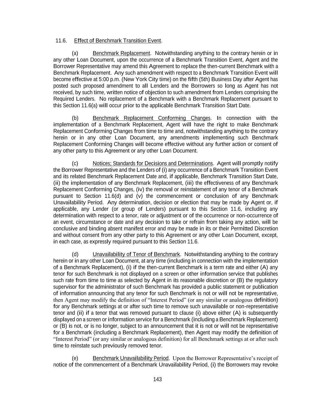 143 11.6. Effect of Benchmark Transition Event. (a) Benchmark Replacement. Notwithstanding anything to the contrary herein or in any other Loan Document, upon the occurrence of a Benchmark Transition Event, Agent and the Borrower Representative may amend this Agreement to replace the then-current Benchmark with a Benchmark Replacement. Any such amendment with respect to a Benchmark Transition Event will become effective at 5:00 p.m. (New York City time) on the fifth (5th) Business Day after Agent has posted such proposed amendment to all Lenders and the Borrowers so long as Agent has not received, by such time, written notice of objection to such amendment from Lenders comprising the Required Lenders. No replacement of a Benchmark with a Benchmark Replacement pursuant to this Section 11.6(a) will occur prior to the applicable Benchmark Transition Start Date. (b) Benchmark Replacement Conforming Changes. In connection with the implementation of a Benchmark Replacement, Agent will have the right to make Benchmark Replacement Conforming Changes from time to time and, notwithstanding anything to the contrary herein or in any other Loan Document, any amendments implementing such Benchmark Replacement Conforming Changes will become effective without any further action or consent of any other party to this Agreement or any other Loan Document. (c) Notices; Standards for Decisions and Determinations. Agent will promptly notify the Borrower Representative and the Lenders of (i) any occurrence of a Benchmark Transition Event and its related Benchmark Replacement Date and, if applicable, Benchmark Transition Start Date, (ii) the implementation of any Benchmark Replacement, (iii) the effectiveness of any Benchmark Replacement Conforming Changes, (iv) the removal or reinstatement of any tenor of a Benchmark pursuant to Section 11.6(d) and (v) the commencement or conclusion of any Benchmark Unavailability Period. Any determination, decision or election that may be made by Agent or, if applicable, any Lender (or group of Lenders) pursuant to this Section 11.6, including any determination with respect to a tenor, rate or adjustment or of the occurrence or non-occurrence of an event, circumstance or date and any decision to take or refrain from taking any action, will be conclusive and binding absent manifest error and may be made in its or their Permitted Discretion and without consent from any other party to this Agreement or any other Loan Document, except, in each case, as expressly required pursuant to this Section 11.6. (d) Unavailability of Tenor of Benchmark. Notwithstanding anything to the contrary herein or in any other Loan Document, at any time (including in connection with the implementation of a Benchmark Replacement), (i) if the then-current Benchmark is a term rate and either (A) any tenor for such Benchmark is not displayed on a screen or other information service that publishes such rate from time to time as selected by Agent in its reasonable discretion or (B) the regulatory supervisor for the administrator of such Benchmark has provided a public statement or publication of information announcing that any tenor for such Benchmark is not or will not be representative, then Agent may modify the definition of “Interest Period” (or any similar or analogous definition) for any Benchmark settings at or after such time to remove such unavailable or non-representative tenor and (ii) if a tenor that was removed pursuant to clause (i) above either (A) is subsequently displayed on a screen or information service for a Benchmark (including a Benchmark Replacement) or (B) is not, or is no longer, subject to an announcement that it is not or will not be representative for a Benchmark (including a Benchmark Replacement), then Agent may modify the definition of “Interest Period” (or any similar or analogous definition) for all Benchmark settings at or after such time to reinstate such previously removed tenor. (e) Benchmark Unavailability Period. Upon the Borrower Representative’s receipt of notice of the commencement of a Benchmark Unavailability Period, (i) the Borrowers may revoke