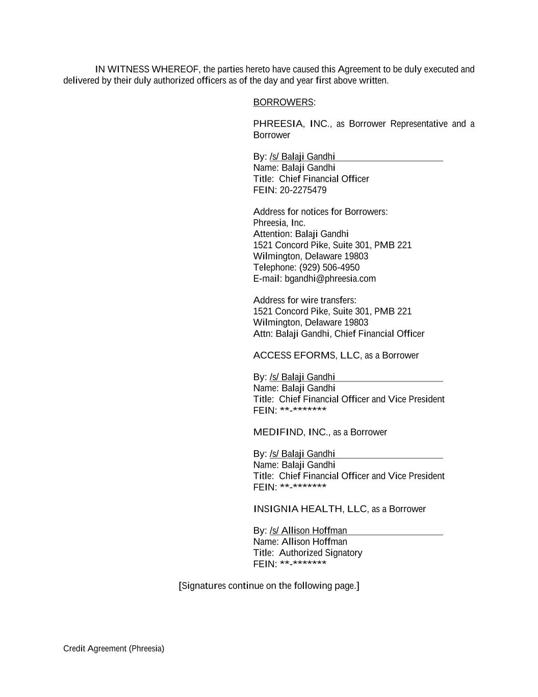 Credit Agreement (Phreesia) IN WITNESS WHEREOF, the parties hereto have caused this Agreement to be duly executed and delivered by their duly authorized officers as of the day and year first above written. BORROWERS: PHREESIA, INC., as Borrower Representative and a Borrower By: /s/ Balaji Gandhi Name: Balaji Gandhi Title: Chief Financial Officer FEIN: 20-2275479 Address for notices for Borrowers: Phreesia, Inc. Attention: Balaji Gandhi 1521 Concord Pike, Suite 301, PMB 221 Wilmington, Delaware 19803 Telephone: (929) 506-4950 E-mail: bgandhi@phreesia.com Address for wire transfers: 1521 Concord Pike, Suite 301, PMB 221 Wilmington, Delaware 19803 Attn: Balaji Gandhi, Chief Financial Officer ACCESS EFORMS, LLC, as a Borrower By: /s/ Balaji Gandhi Name: Balaji Gandhi Title: Chief Financial Officer and Vice President FEIN: **-******* MEDIFIND, INC., as a Borrower By: /s/ Balaji Gandhi Name: Balaji Gandhi Title: Chief Financial Officer and Vice President FEIN: **-******* INSIGNIA HEALTH, LLC, as a Borrower By: /s/ Allison Hoffman Name: Allison Hoffman Title: Authorized Signatory FEIN: **-******* [Signatures continue on the following page.]