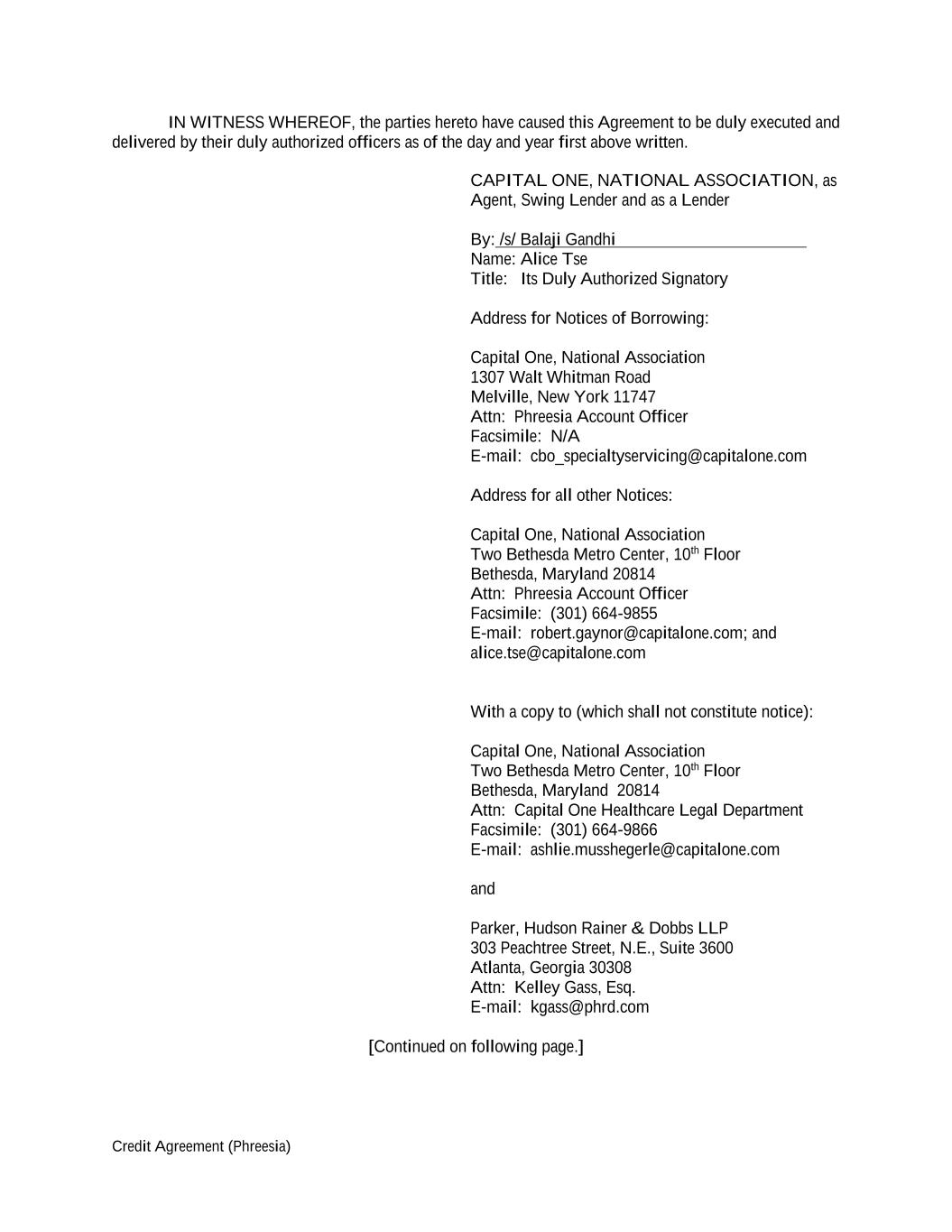 Credit Agreement (Phreesia) IN WITNESS WHEREOF, the parties hereto have caused this Agreement to be duly executed and delivered by their duly authorized officers as of the day and year first above written. CAPITAL ONE, NATIONAL ASSOCIATION, as Agent, Swing Lender and as a Lender By: /s/ Balaji Gandhi Name: Alice Tse Title: Its Duly Authorized Signatory Address for Notices of Borrowing: Capital One, National Association 1307 Walt Whitman Road Melville, New York 11747 Attn: Phreesia Account Officer Facsimile: N/A E-mail: cbo_specialtyservicing@capitalone.com Address for all other Notices: Capital One, National Association Two Bethesda Metro Center, 10th Floor Bethesda, Maryland 20814 Attn: Phreesia Account Officer Facsimile: (301) 664-9855 E-mail: robert.gaynor@capitalone.com; and alice.tse@capitalone.com With a copy to (which shall not constitute notice): Capital One, National Association Two Bethesda Metro Center, 10th Floor Bethesda, Maryland 20814 Attn: Capital One Healthcare Legal Department Facsimile: (301) 664-9866 E-mail: ashlie.musshegerle@capitalone.com and Parker, Hudson Rainer & Dobbs LLP 303 Peachtree Street, N.E., Suite 3600 Atlanta, Georgia 30308 Attn: Kelley Gass, Esq. E-mail: kgass@phrd.com [Continued on following page.]