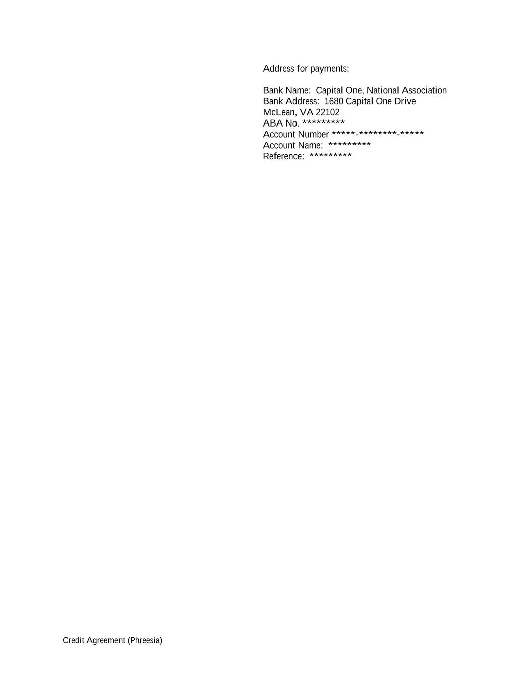 Credit Agreement (Phreesia) Address for payments: Bank Name: Capital One, National Association Bank Address: 1680 Capital One Drive McLean, VA 22102 ABA No. ********* Account Number *****-********-***** Account Name: ********* Reference: *********