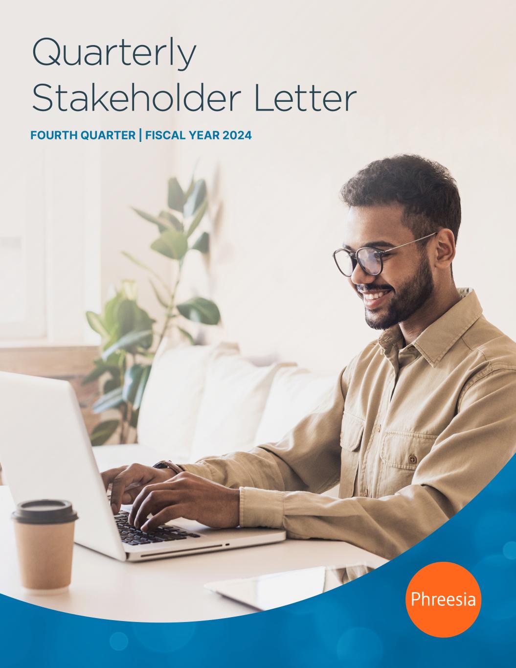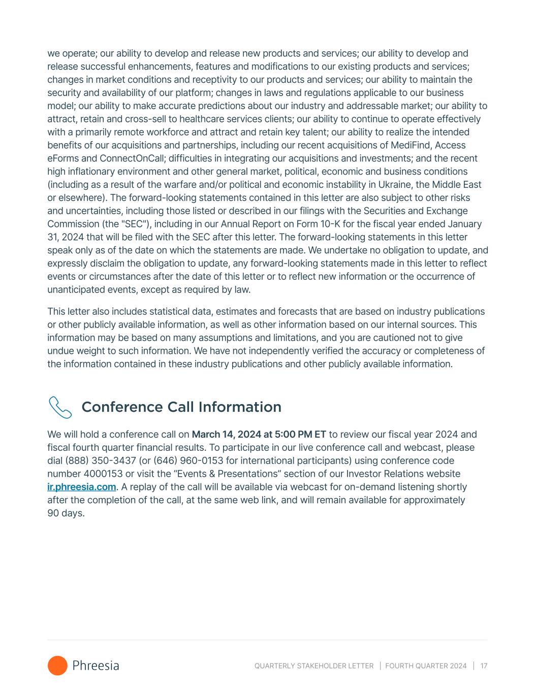 QUARTERLY STAKEHOLDER LETTER | FOURTH QUARTER 2024 | 17 we operate; our ability to develop and release new products and services; our ability to develop and release successful enhancements, features and modifications to our existing products and services; changes in market conditions and receptivity to our products and services; our ability to maintain the security and availability of our platform; changes in laws and regulations applicable to our business model; our ability to make accurate predictions about our industry and addressable market; our ability to attract, retain and cross-sell to healthcare services clients; our ability to continue to operate effectively with a primarily remote workforce and attract and retain key talent; our ability to realize the intended benefits of our acquisitions and partnerships, including our recent acquisitions of MediFind, Access eForms and ConnectOnCall; difficulties in integrating our acquisitions and investments; and the recent high inflationary environment and other general market, political, economic and business conditions (including as a result of the warfare and/or political and economic instability in Ukraine, the Middle East or elsewhere). The forward-looking statements contained in this letter are also subject to other risks and uncertainties, including those listed or described in our filings with the Securities and Exchange Commission (the "SEC"), including in our Annual Report on Form 10-K for the fiscal year ended January 31, 2024 that will be filed with the SEC after this letter. The forward-looking statements in this letter speak only as of the date on which the statements are made. We undertake no obligation to update, and expressly disclaim the obligation to update, any forward-looking statements made in this letter to reflect events or circumstances after the date of this letter or to reflect new information or the occurrence of unanticipated events, except as required by law. This letter also includes statistical data, estimates and forecasts that are based on industry publications or other publicly available information, as well as other information based on our internal sources. This information may be based on many assumptions and limitations, and you are cautioned not to give undue weight to such information. We have not independently verified the accuracy or completeness of the information contained in these industry publications and other publicly available information. Conference Call Information We will hold a conference call on March 14, 2024 at 5:00 PM ET to review our fiscal year 2024 and fiscal fourth quarter financial results. To participate in our live conference call and webcast, please dial (888) 350-3437 (or (646) 960-0153 for international participants) using conference code number 4000153 or visit the “Events & Presentations” section of our Investor Relations website ir.phreesia.com. A replay of the call will be available via webcast for on-demand listening shortly after the completion of the call, at the same web link, and will remain available for approximately 90 days.