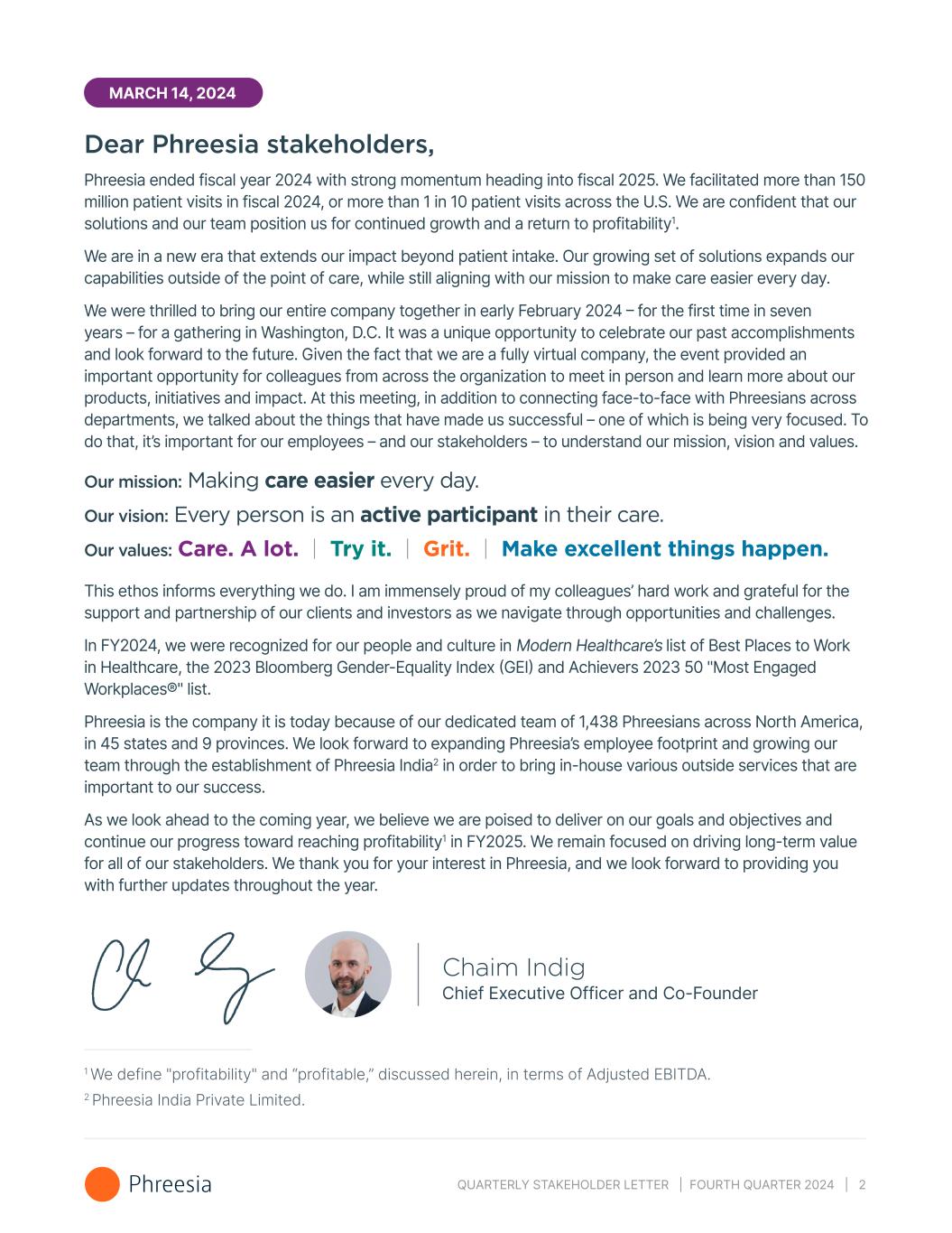 QUARTERLY STAKEHOLDER LETTER | FOURTH QUARTER 2024 | 2 1 We define "profitability" and “profitable,” discussed herein, in terms of Adjusted EBITDA. 2 Phreesia India Private Limited. Dear Phreesia stakeholders, Phreesia ended fiscal year 2024 with strong momentum heading into fiscal 2025. We facilitated more than 150 million patient visits in fiscal 2024, or more than 1 in 10 patient visits across the U.S. We are confident that our solutions and our team position us for continued growth and a return to profitability1. We are in a new era that extends our impact beyond patient intake. Our growing set of solutions expands our capabilities outside of the point of care, while still aligning with our mission to make care easier every day. We were thrilled to bring our entire company together in early February 2024 – for the first time in seven years – for a gathering in Washington, D.C. It was a unique opportunity to celebrate our past accomplishments and look forward to the future. Given the fact that we are a fully virtual company, the event provided an important opportunity for colleagues from across the organization to meet in person and learn more about our products, initiatives and impact. At this meeting, in addition to connecting face-to-face with Phreesians across departments, we talked about the things that have made us successful – one of which is being very focused. To do that, it’s important for our employees – and our stakeholders – to understand our mission, vision and values. Our mission: Making care easier every day. Our vision: Every person is an active participant in their care. Our values: Care. A lot. | Try it. | Grit. | Make excellent things happen. This ethos informs everything we do. I am immensely proud of my colleagues’ hard work and grateful for the support and partnership of our clients and investors as we navigate through opportunities and challenges. In FY2024, we were recognized for our people and culture in Modern Healthcare’s list of Best Places to Work in Healthcare, the 2023 Bloomberg Gender-Equality Index (GEI) and Achievers 2023 50 "Most Engaged Workplaces®" list. Phreesia is the company it is today because of our dedicated team of 1,438 Phreesians across North America, in 45 states and 9 provinces. We look forward to expanding Phreesia’s employee footprint and growing our team through the establishment of Phreesia India2 in order to bring in-house various outside services that are important to our success. As we look ahead to the coming year, we believe we are poised to deliver on our goals and objectives and continue our progress toward reaching profitability1 in FY2025. We remain focused on driving long-term value for all of our stakeholders. We thank you for your interest in Phreesia, and we look forward to providing you with further updates throughout the year. MARCH 14, 2024 Chaim Indig Chief Executive Officer and Co-Founder