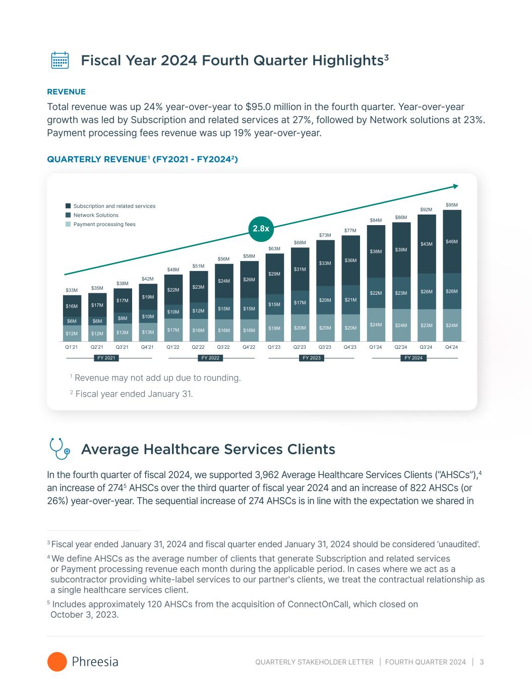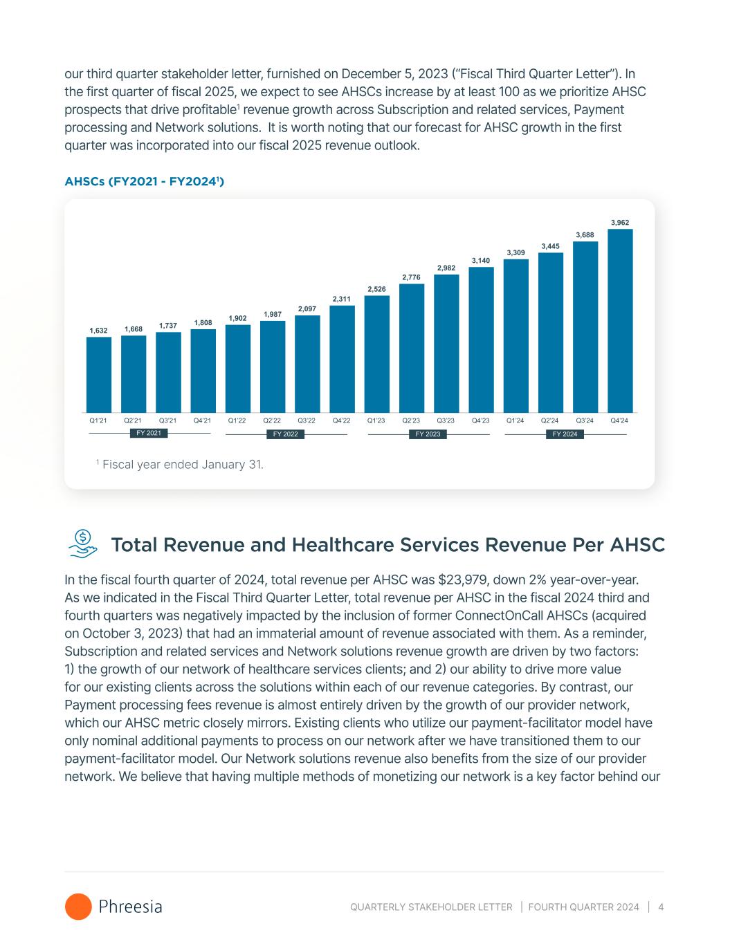 QUARTERLY STAKEHOLDER LETTER | FOURTH QUARTER 2024 | 3 Fiscal Year 2024 Fourth Quarter Highlights3 REVENUE Total revenue was up 24% year-over-year to $95.0 million in the fourth quarter. Year-over-year growth was led by Subscription and related services at 27%, followed by Network solutions at 23%. Payment processing fees revenue was up 19% year-over-year. QUARTERLY REVENUE1 (FY2021 - FY20242) Subscription and related services Payment processing fees Network Solutions 1 Revenue may not add up due to rounding. 2 Fiscal year ended January 31. Average Healthcare Services Clients In the fourth quarter of fiscal 2024, we supported 3,962 Average Healthcare Services Clients (“AHSCs”),4 an increase of 2745 AHSCs over the third quarter of fiscal year 2024 and an increase of 822 AHSCs (or 26%) year-over-year. The sequential increase of 274 AHSCs is in line with the expectation we shared in 3 Fiscal year ended January 31, 2024 and fiscal quarter ended January 31, 2024 should be considered ‘unaudited'. 4 We define AHSCs as the average number of clients that generate Subscription and related services or Payment processing revenue each month during the applicable period. In cases where we act as a subcontractor providing white-label services to our partner's clients, we treat the contractual relationship as a single healthcare services client. 5 Includes approximately 120 AHSCs from the acquisition of ConnectOnCall, which closed on October 3, 2023.
