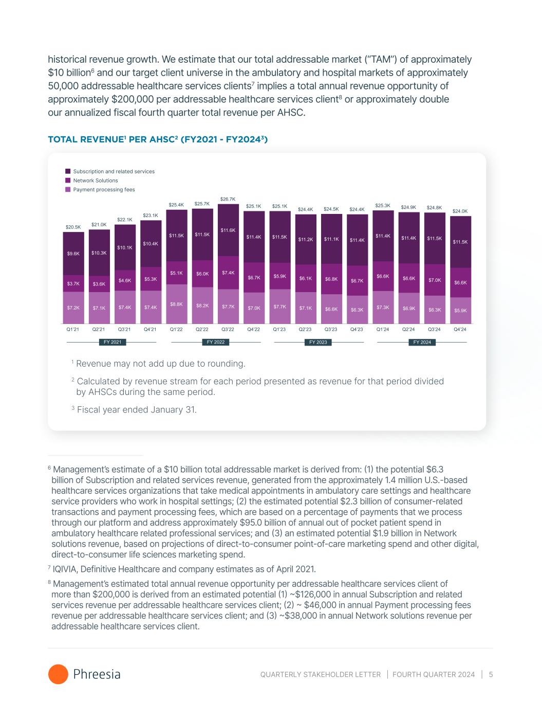 QUARTERLY STAKEHOLDER LETTER | FOURTH QUARTER 2024 | 4 our third quarter stakeholder letter, furnished on December 5, 2023 (“Fiscal Third Quarter Letter”). In the first quarter of fiscal 2025, we expect to see AHSCs increase by at least 100 as we prioritize AHSC prospects that drive profitable1 revenue growth across Subscription and related services, Payment processing and Network solutions. It is worth noting that our forecast for AHSC growth in the first quarter was incorporated into our fiscal 2025 revenue outlook. AHSCs (FY2021 - FY20241) 1 Fiscal year ended January 31. Total Revenue and Healthcare Services Revenue Per AHSC In the fiscal fourth quarter of 2024, total revenue per AHSC was $23,979, down 2% year-over-year. As we indicated in the Fiscal Third Quarter Letter, total revenue per AHSC in the fiscal 2024 third and fourth quarters was negatively impacted by the inclusion of former ConnectOnCall AHSCs (acquired on October 3, 2023) that had an immaterial amount of revenue associated with them. As a reminder, Subscription and related services and Network solutions revenue growth are driven by two factors: 1) the growth of our network of healthcare services clients; and 2) our ability to drive more value for our existing clients across the solutions within each of our revenue categories. By contrast, our Payment processing fees revenue is almost entirely driven by the growth of our provider network, which our AHSC metric closely mirrors. Existing clients who utilize our payment-facilitator model have only nominal additional payments to process on our network after we have transitioned them to our payment-facilitator model. Our Network solutions revenue also benefits from the size of our provider network. We believe that having multiple methods of monetizing our network is a key factor behind our