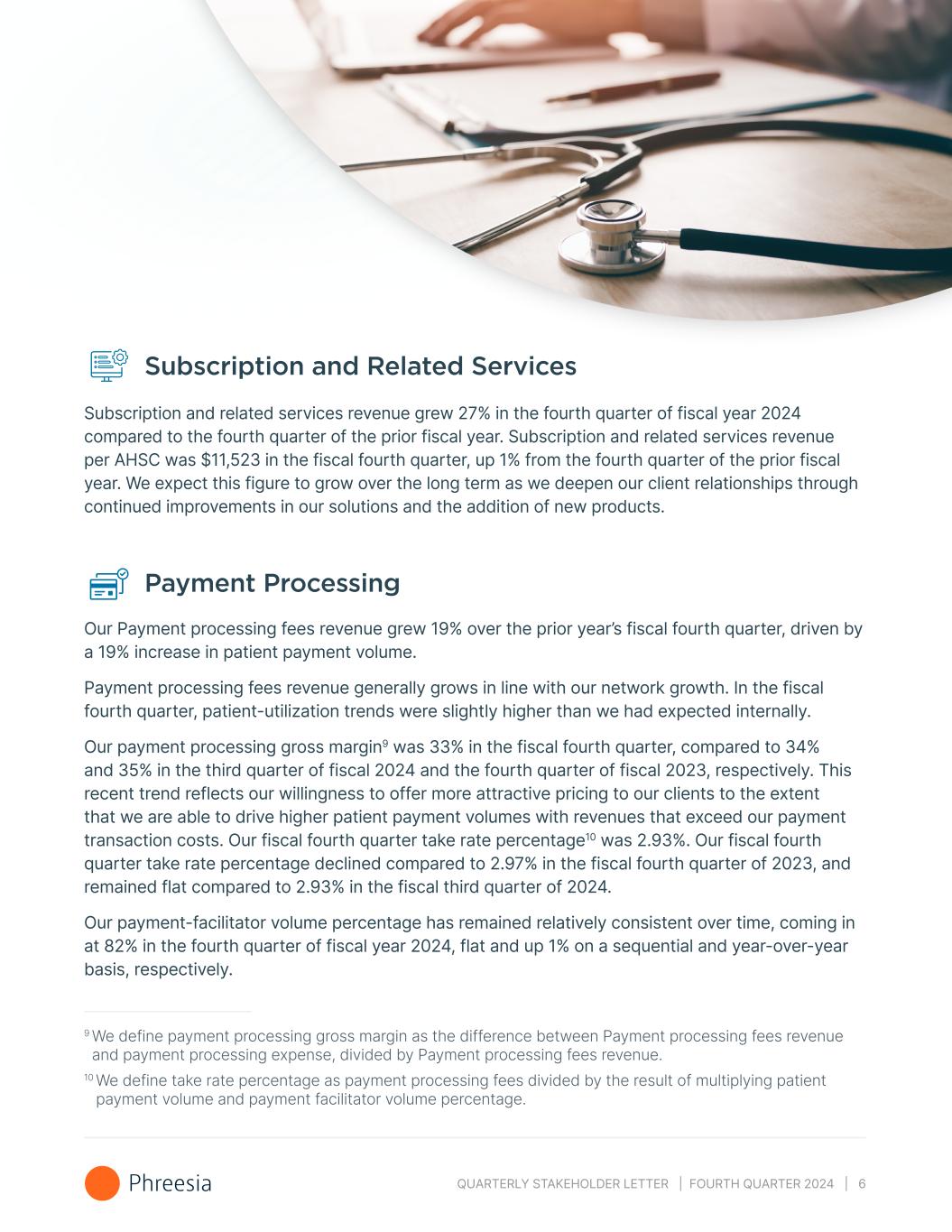 QUARTERLY STAKEHOLDER LETTER | FOURTH QUARTER 2024 | 6 Subscription and Related Services Subscription and related services revenue grew 27% in the fourth quarter of fiscal year 2024 compared to the fourth quarter of the prior fiscal year. Subscription and related services revenue per AHSC was $11,523 in the fiscal fourth quarter, up 1% from the fourth quarter of the prior fiscal year. We expect this figure to grow over the long term as we deepen our client relationships through continued improvements in our solutions and the addition of new products. Payment Processing Our Payment processing fees revenue grew 19% over the prior year’s fiscal fourth quarter, driven by a 19% increase in patient payment volume. Payment processing fees revenue generally grows in line with our network growth. In the fiscal fourth quarter, patient-utilization trends were slightly higher than we had expected internally. Our payment processing gross margin9 was 33% in the fiscal fourth quarter, compared to 34% and 35% in the third quarter of fiscal 2024 and the fourth quarter of fiscal 2023, respectively. This recent trend reflects our willingness to offer more attractive pricing to our clients to the extent that we are able to drive higher patient payment volumes with revenues that exceed our payment transaction costs. Our fiscal fourth quarter take rate percentage10 was 2.93%. Our fiscal fourth quarter take rate percentage declined compared to 2.97% in the fiscal fourth quarter of 2023, and remained flat compared to 2.93% in the fiscal third quarter of 2024. Our payment-facilitator volume percentage has remained relatively consistent over time, coming in at 82% in the fourth quarter of fiscal year 2024, flat and up 1% on a sequential and year-over-year basis, respectively. 9 We define payment processing gross margin as the difference between Payment processing fees revenue and payment processing expense, divided by Payment processing fees revenue. 10 We define take rate percentage as payment processing fees divided by the result of multiplying patient payment volume and payment facilitator volume percentage.