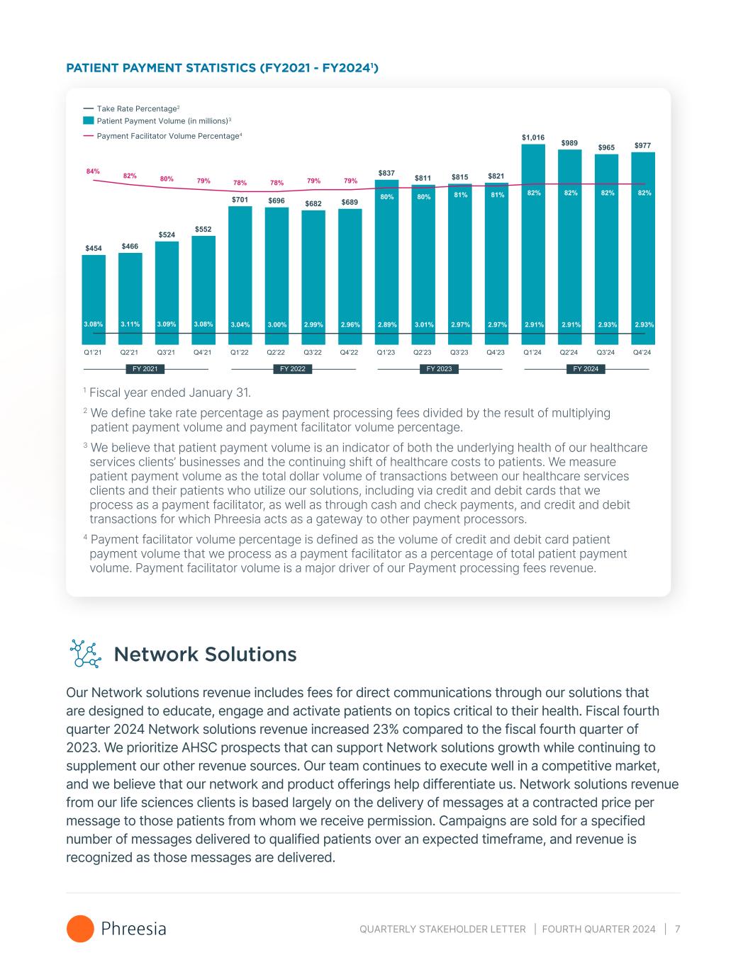 QUARTERLY STAKEHOLDER LETTER | FOURTH QUARTER 2024 | 7 PATIENT PAYMENT STATISTICS (FY2021 - FY20241) Payment Facilitator Volume Percentage4 Take Rate Percentage2 Patient Payment Volume (in millions)3 1 Fiscal year ended January 31. 2 We define take rate percentage as payment processing fees divided by the result of multiplying patient payment volume and payment facilitator volume percentage. 3 We believe that patient payment volume is an indicator of both the underlying health of our healthcare services clients’ businesses and the continuing shift of healthcare costs to patients. We measure patient payment volume as the total dollar volume of transactions between our healthcare services clients and their patients who utilize our solutions, including via credit and debit cards that we process as a payment facilitator, as well as through cash and check payments, and credit and debit transactions for which Phreesia acts as a gateway to other payment processors. 4 Payment facilitator volume percentage is defined as the volume of credit and debit card patient payment volume that we process as a payment facilitator as a percentage of total patient payment volume. Payment facilitator volume is a major driver of our Payment processing fees revenue. Network Solutions Our Network solutions revenue includes fees for direct communications through our solutions that are designed to educate, engage and activate patients on topics critical to their health. Fiscal fourth quarter 2024 Network solutions revenue increased 23% compared to the fiscal fourth quarter of 2023. We prioritize AHSC prospects that can support Network solutions growth while continuing to supplement our other revenue sources. Our team continues to execute well in a competitive market, and we believe that our network and product offerings help differentiate us. Network solutions revenue from our life sciences clients is based largely on the delivery of messages at a contracted price per message to those patients from whom we receive permission. Campaigns are sold for a specified number of messages delivered to qualified patients over an expected timeframe, and revenue is recognized as those messages are delivered.