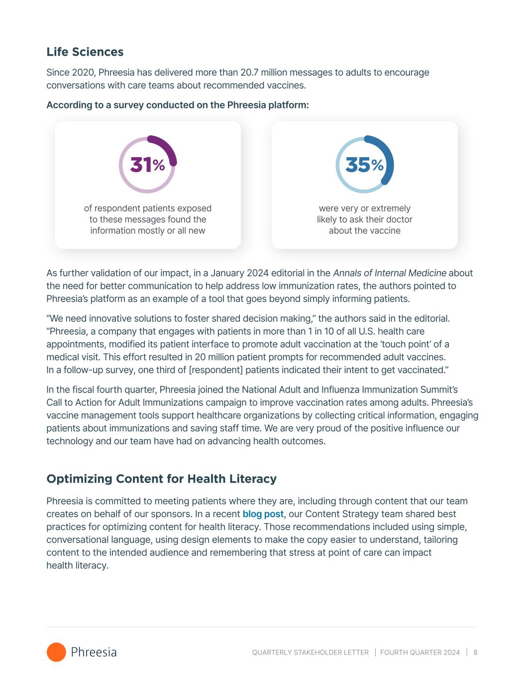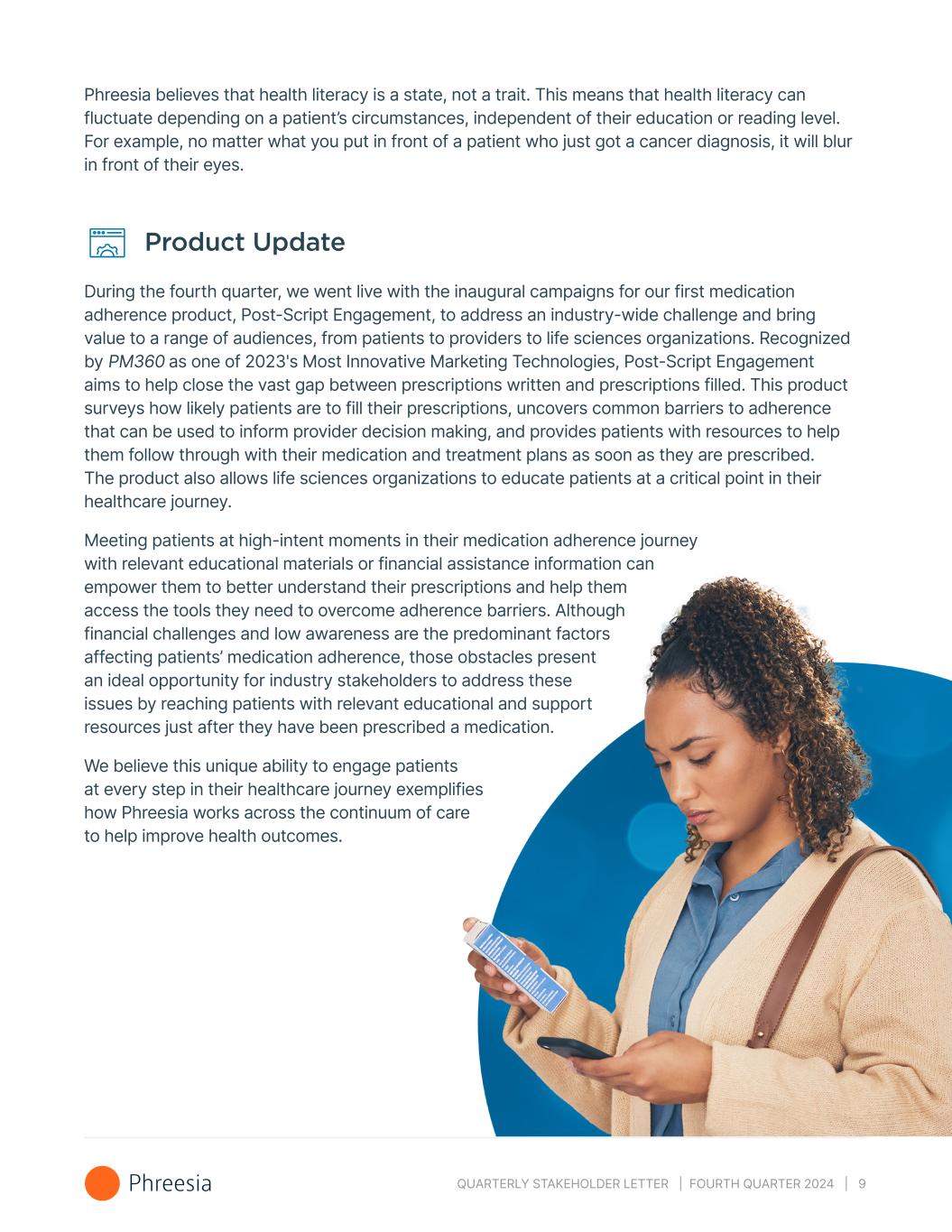 QUARTERLY STAKEHOLDER LETTER | FOURTH QUARTER 2024 | 9 Phreesia believes that health literacy is a state, not a trait. This means that health literacy can fluctuate depending on a patient’s circumstances, independent of their education or reading level. For example, no matter what you put in front of a patient who just got a cancer diagnosis, it will blur in front of their eyes. Product Update During the fourth quarter, we went live with the inaugural campaigns for our first medication adherence product, Post-Script Engagement, to address an industry-wide challenge and bring value to a range of audiences, from patients to providers to life sciences organizations. Recognized by PM360 as one of 2023's Most Innovative Marketing Technologies, Post-Script Engagement aims to help close the vast gap between prescriptions written and prescriptions filled. This product surveys how likely patients are to fill their prescriptions, uncovers common barriers to adherence that can be used to inform provider decision making, and provides patients with resources to help them follow through with their medication and treatment plans as soon as they are prescribed. The product also allows life sciences organizations to educate patients at a critical point in their healthcare journey. Meeting patients at high-intent moments in their medication adherence journey with relevant educational materials or financial assistance information can empower them to better understand their prescriptions and help them access the tools they need to overcome adherence barriers. Although financial challenges and low awareness are the predominant factors affecting patients’ medication adherence, those obstacles present an ideal opportunity for industry stakeholders to address these issues by reaching patients with relevant educational and support resources just after they have been prescribed a medication. We believe this unique ability to engage patients at every step in their healthcare journey exemplifies how Phreesia works across the continuum of care to help improve health outcomes.