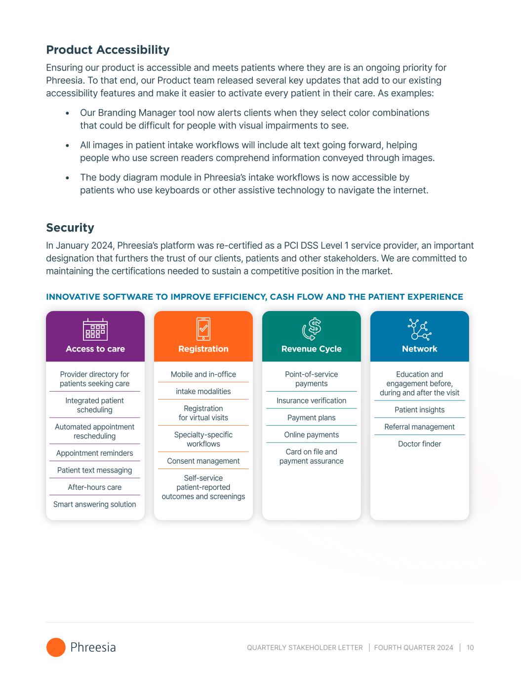 QUARTERLY STAKEHOLDER LETTER | FOURTH QUARTER 2024 | 10 Product Accessibility Ensuring our product is accessible and meets patients where they are is an ongoing priority for Phreesia. To that end, our Product team released several key updates that add to our existing accessibility features and make it easier to activate every patient in their care. As examples: • Our Branding Manager tool now alerts clients when they select color combinations that could be difficult for people with visual impairments to see. • All images in patient intake workflows will include alt text going forward, helping people who use screen readers comprehend information conveyed through images. • The body diagram module in Phreesia’s intake workflows is now accessible by patients who use keyboards or other assistive technology to navigate the internet. Security In January 2024, Phreesia’s platform was re-certified as a PCI DSS Level 1 service provider, an important designation that furthers the trust of our clients, patients and other stakeholders. We are committed to maintaining the certifications needed to sustain a competitive position in the market. INNOVATIVE SOFTWARE TO IMPROVE EFFICIENCY, CASH FLOW AND THE PATIENT EXPERIENCE Access to care Registration Revenue Cycle Network Provider directory for patients seeking care Integrated patient scheduling Automated appointment rescheduling Appointment reminders Patient text messaging After-hours care Smart answering solution Mobile and in-office intake modalities Registration for virtual visits Specialty-specific workflows Consent management Self-service patient-reported outcomes and screenings Point-of-service payments Insurance verification Payment plans Online payments Card on file and payment assurance Education and engagement before, during and after the visit Patient insights Referral management Doctor finder