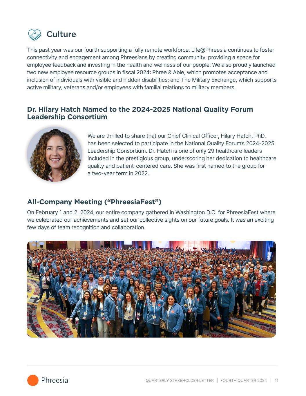 QUARTERLY STAKEHOLDER LETTER | FOURTH QUARTER 2024 | 11 Culture This past year was our fourth supporting a fully remote workforce. Life@Phreesia continues to foster connectivity and engagement among Phreesians by creating community, providing a space for employee feedback and investing in the health and wellness of our people. We also proudly launched two new employee resource groups in fiscal 2024: Phree & Able, which promotes acceptance and inclusion of individuals with visible and hidden disabilities; and The Military Exchange, which supports active military, veterans and/or employees with familial relations to military members. Dr. Hilary Hatch Named to the 2024-2025 National Quality Forum Leadership Consortium We are thrilled to share that our Chief Clinical Officer, Hilary Hatch, PhD, has been selected to participate in the National Quality Forum’s 2024-2025 Leadership Consortium. Dr. Hatch is one of only 29 healthcare leaders included in the prestigious group, underscoring her dedication to healthcare quality and patient-centered care. She was first named to the group for a two-year term in 2022. All-Company Meeting (“PhreesiaFest”) On February 1 and 2, 2024, our entire company gathered in Washington D.C. for PhreesiaFest where we celebrated our achievements and set our collective sights on our future goals. It was an exciting few days of team recognition and collaboration.