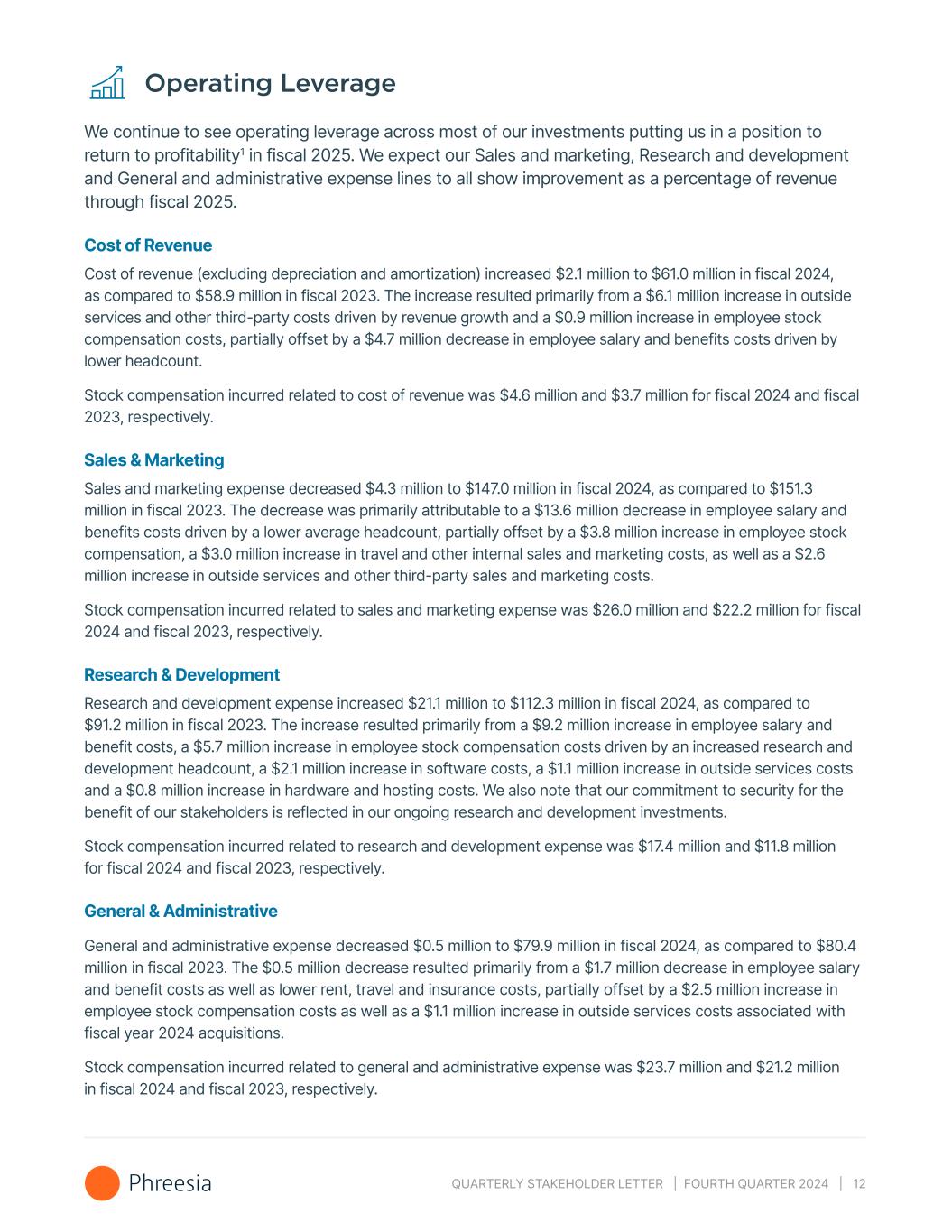 QUARTERLY STAKEHOLDER LETTER | FOURTH QUARTER 2024 | 12 Operating Leverage We continue to see operating leverage across most of our investments putting us in a position to return to profitability1 in fiscal 2025. We expect our Sales and marketing, Research and development and General and administrative expense lines to all show improvement as a percentage of revenue through fiscal 2025. Cost of Revenue Cost of revenue (excluding depreciation and amortization) increased $2.1 million to $61.0 million in fiscal 2024, as compared to $58.9 million in fiscal 2023. The increase resulted primarily from a $6.1 million increase in outside services and other third-party costs driven by revenue growth and a $0.9 million increase in employee stock compensation costs, partially offset by a $4.7 million decrease in employee salary and benefits costs driven by lower headcount. Stock compensation incurred related to cost of revenue was $4.6 million and $3.7 million for fiscal 2024 and fiscal 2023, respectively. Sales & Marketing Sales and marketing expense decreased $4.3 million to $147.0 million in fiscal 2024, as compared to $151.3 million in fiscal 2023. The decrease was primarily attributable to a $13.6 million decrease in employee salary and benefits costs driven by a lower average headcount, partially offset by a $3.8 million increase in employee stock compensation, a $3.0 million increase in travel and other internal sales and marketing costs, as well as a $2.6 million increase in outside services and other third-party sales and marketing costs. Stock compensation incurred related to sales and marketing expense was $26.0 million and $22.2 million for fiscal 2024 and fiscal 2023, respectively. Research & Development Research and development expense increased $21.1 million to $112.3 million in fiscal 2024, as compared to $91.2 million in fiscal 2023. The increase resulted primarily from a $9.2 million increase in employee salary and benefit costs, a $5.7 million increase in employee stock compensation costs driven by an increased research and development headcount, a $2.1 million increase in software costs, a $1.1 million increase in outside services costs and a $0.8 million increase in hardware and hosting costs. We also note that our commitment to security for the benefit of our stakeholders is reflected in our ongoing research and development investments. Stock compensation incurred related to research and development expense was $17.4 million and $11.8 million for fiscal 2024 and fiscal 2023, respectively. General & Administrative General and administrative expense decreased $0.5 million to $79.9 million in fiscal 2024, as compared to $80.4 million in fiscal 2023. The $0.5 million decrease resulted primarily from a $1.7 million decrease in employee salary and benefit costs as well as lower rent, travel and insurance costs, partially offset by a $2.5 million increase in employee stock compensation costs as well as a $1.1 million increase in outside services costs associated with fiscal year 2024 acquisitions. Stock compensation incurred related to general and administrative expense was $23.7 million and $21.2 million in fiscal 2024 and fiscal 2023, respectively.
