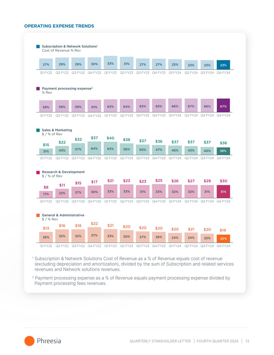 QUARTERLY STAKEHOLDER LETTER | FOURTH QUARTER 2024 | 13 OPERATING EXPENSE TRENDS Payment processing expense2 % Rev 58% Q1 FY22 59% Q2 FY22 59% Q3 FY22 61% Q4 FY22 63% Q1 FY23 64% Q2 FY23 65% Q3 FY23 Q4 FY23 65% Q1 FY24 66% Q2 FY24 67% Q3 FY24 66% Q4 FY24 67% Subscription & Network Solutions1 Cost of Revenue % Rev 27% Q1 FY22 29% Q2 FY22 29% Q3 FY22 30% Q4 FY22 33% Q1 FY23 31% Q2 FY23 27% Q3 FY23 Q4 FY23 27% Q1 FY24 25% Q2 FY24 23% Q3 FY24 23% Q4 FY24 23% Sales & Marketing $ / % of Rev Q1 FY22 31% $15 Q2 FY22 43% $22 Q3 FY22 57% $32 Q4 FY22 64% $37 Q1 FY23 63% $40 Q2 FY23 56% $38 Q3 FY23 50% $37 Q4 FY23 47% $36 Q1 FY24 45% $37 Q2 FY24 43% $37 Q3 FY24 40% $37 Q4 FY24 38% $36 Research & Development $ / % of Rev Q1 FY22 17% $8 22% Q2 FY22 $11 27% Q3 FY22 $15 30% Q4 FY22 $17 33% Q1 FY23 $21 33% Q2 FY23 $23 31% Q3 FY23 $23 Q4 FY23 33% $25 Q1 FY24 32% $26 Q2 FY24 32% $27 Q3 FY24 31% $29 Q4 FY24 31% $30 General & Administrative $ / % Rev Q1 FY22 26% $13 Q2 FY22 32% $16 Q3 FY22 32% $18 Q4 FY22 37% $22 Q1 FY23 33% $21 Q2 FY23 30% $20 Q3 FY23 27% $20 Q4 FY23 26% $20 Q1 FY24 24% $20 Q2 FY24 24% $21 Q3 FY24 22% $20 Q4 FY24 20% $19 1 Subscription & Network Solutions Cost of Revenue as a % of Revenue equals cost of revenue (excluding depreciation and amortization), divided by the sum of Subscription and related services revenues and Network solutions revenues. 2 Payment processing expense as a % of Revenue equals payment processing expense divided by Payment processing fees revenues.