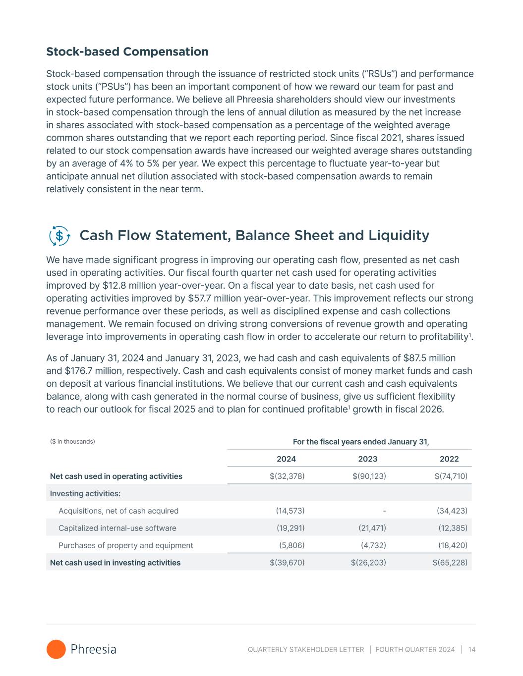 QUARTERLY STAKEHOLDER LETTER | FOURTH QUARTER 2024 | 14 Stock-based Compensation Stock-based compensation through the issuance of restricted stock units (“RSUs”) and performance stock units (“PSUs”) has been an important component of how we reward our team for past and expected future performance. We believe all Phreesia shareholders should view our investments in stock-based compensation through the lens of annual dilution as measured by the net increase in shares associated with stock-based compensation as a percentage of the weighted average common shares outstanding that we report each reporting period. Since fiscal 2021, shares issued related to our stock compensation awards have increased our weighted average shares outstanding by an average of 4% to 5% per year. We expect this percentage to fluctuate year-to-year but anticipate annual net dilution associated with stock-based compensation awards to remain relatively consistent in the near term. Cash Flow Statement, Balance Sheet and Liquidity We have made significant progress in improving our operating cash flow, presented as net cash used in operating activities. Our fiscal fourth quarter net cash used for operating activities improved by $12.8 million year-over-year. On a fiscal year to date basis, net cash used for operating activities improved by $57.7 million year-over-year. This improvement reflects our strong revenue performance over these periods, as well as disciplined expense and cash collections management. We remain focused on driving strong conversions of revenue growth and operating leverage into improvements in operating cash flow in order to accelerate our return to profitability1. As of January 31, 2024 and January 31, 2023, we had cash and cash equivalents of $87.5 million and $176.7 million, respectively. Cash and cash equivalents consist of money market funds and cash on deposit at various financial institutions. We believe that our current cash and cash equivalents balance, along with cash generated in the normal course of business, give us sufficient flexibility to reach our outlook for fiscal 2025 and to plan for continued profitable1 growth in fiscal 2026. ($ in thousands) For the fiscal years ended January 31, 2024 2023 2022 Net cash used in operating activities $(32,378) $(90,123) $(74,710) Investing activities: Acquisitions, net of cash acquired (14,573) - (34,423) Capitalized internal-use software (19,291) (21,471) (12,385) Purchases of property and equipment (5,806) (4,732) (18,420) Net cash used in investing activities $(39,670) $(26,203) $(65,228)