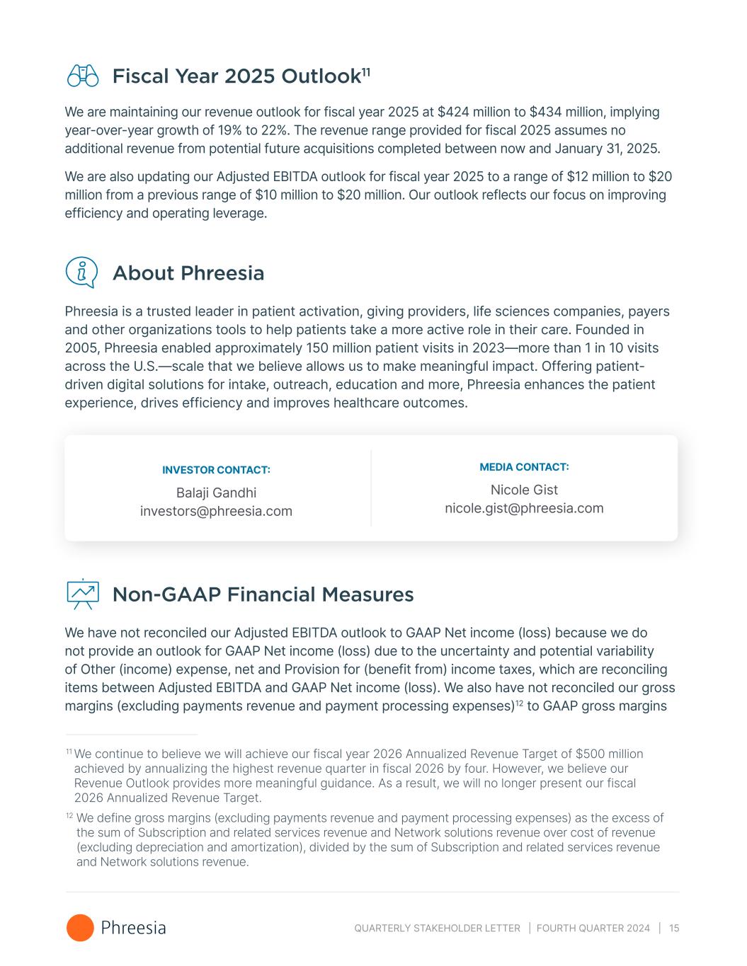 QUARTERLY STAKEHOLDER LETTER | FOURTH QUARTER 2024 | 15 Fiscal Year 2025 Outlook11 We are maintaining our revenue outlook for fiscal year 2025 at $424 million to $434 million, implying year-over-year growth of 19% to 22%. The revenue range provided for fiscal 2025 assumes no additional revenue from potential future acquisitions completed between now and January 31, 2025. We are also updating our Adjusted EBITDA outlook for fiscal year 2025 to a range of $12 million to $20 million from a previous range of $10 million to $20 million. Our outlook reflects our focus on improving efficiency and operating leverage. About Phreesia Phreesia is a trusted leader in patient activation, giving providers, life sciences companies, payers and other organizations tools to help patients take a more active role in their care. Founded in 2005, Phreesia enabled approximately 150 million patient visits in 2023—more than 1 in 10 visits across the U.S.—scale that we believe allows us to make meaningful impact. Offering patient- driven digital solutions for intake, outreach, education and more, Phreesia enhances the patient experience, drives efficiency and improves healthcare outcomes. INVESTOR CONTACT: Balaji Gandhi investors@phreesia.com MEDIA CONTACT: Nicole Gist nicole.gist@phreesia.com Non-GAAP Financial Measures We have not reconciled our Adjusted EBITDA outlook to GAAP Net income (loss) because we do not provide an outlook for GAAP Net income (loss) due to the uncertainty and potential variability of Other (income) expense, net and Provision for (benefit from) income taxes, which are reconciling items between Adjusted EBITDA and GAAP Net income (loss). We also have not reconciled our gross margins (excluding payments revenue and payment processing expenses)12 to GAAP gross margins 11 We continue to believe we will achieve our fiscal year 2026 Annualized Revenue Target of $500 million achieved by annualizing the highest revenue quarter in fiscal 2026 by four. However, we believe our Revenue Outlook provides more meaningful guidance. As a result, we will no longer present our fiscal 2026 Annualized Revenue Target. 12 We define gross margins (excluding payments revenue and payment processing expenses) as the excess of the sum of Subscription and related services revenue and Network solutions revenue over cost of revenue (excluding depreciation and amortization), divided by the sum of Subscription and related services revenue and Network solutions revenue.