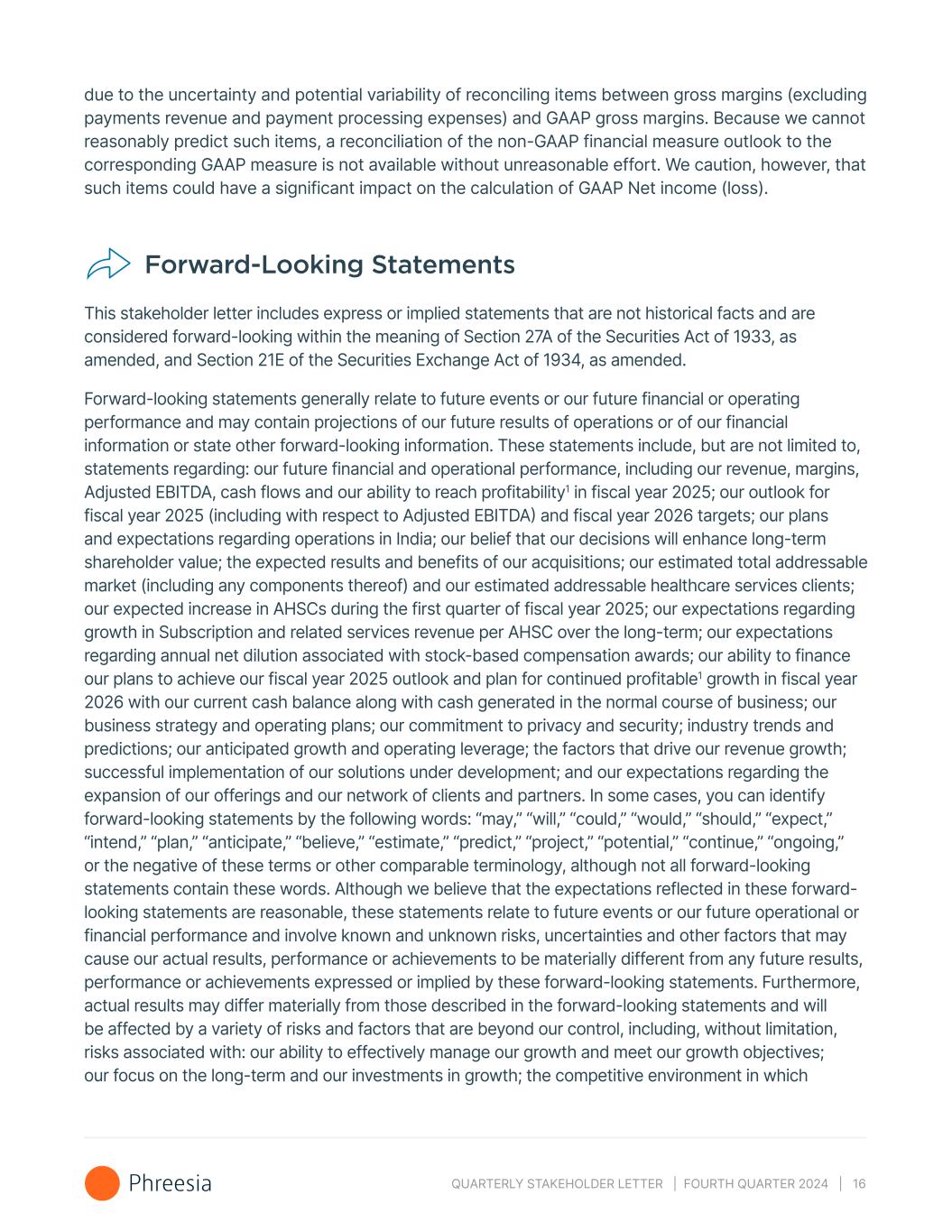QUARTERLY STAKEHOLDER LETTER | FOURTH QUARTER 2024 | 16 due to the uncertainty and potential variability of reconciling items between gross margins (excluding payments revenue and payment processing expenses) and GAAP gross margins. Because we cannot reasonably predict such items, a reconciliation of the non-GAAP financial measure outlook to the corresponding GAAP measure is not available without unreasonable effort. We caution, however, that such items could have a significant impact on the calculation of GAAP Net income (loss). Forward-Looking Statements This stakeholder letter includes express or implied statements that are not historical facts and are considered forward-looking within the meaning of Section 27A of the Securities Act of 1933, as amended, and Section 21E of the Securities Exchange Act of 1934, as amended. Forward-looking statements generally relate to future events or our future financial or operating performance and may contain projections of our future results of operations or of our financial information or state other forward-looking information. These statements include, but are not limited to, statements regarding: our future financial and operational performance, including our revenue, margins, Adjusted EBITDA, cash flows and our ability to reach profitability1 in fiscal year 2025; our outlook for fiscal year 2025 (including with respect to Adjusted EBITDA) and fiscal year 2026 targets; our plans and expectations regarding operations in India; our belief that our decisions will enhance long-term shareholder value; the expected results and benefits of our acquisitions; our estimated total addressable market (including any components thereof) and our estimated addressable healthcare services clients; our expected increase in AHSCs during the first quarter of fiscal year 2025; our expectations regarding growth in Subscription and related services revenue per AHSC over the long-term; our expectations regarding annual net dilution associated with stock-based compensation awards; our ability to finance our plans to achieve our fiscal year 2025 outlook and plan for continued profitable1 growth in fiscal year 2026 with our current cash balance along with cash generated in the normal course of business; our business strategy and operating plans; our commitment to privacy and security; industry trends and predictions; our anticipated growth and operating leverage; the factors that drive our revenue growth; successful implementation of our solutions under development; and our expectations regarding the expansion of our offerings and our network of clients and partners. In some cases, you can identify forward-looking statements by the following words: “may,” “will,” “could,” “would,” “should,” “expect,” “intend,” “plan,” “anticipate,” “believe,” “estimate,” “predict,” “project,” “potential,” “continue,” “ongoing,” or the negative of these terms or other comparable terminology, although not all forward-looking statements contain these words. Although we believe that the expectations reflected in these forward- looking statements are reasonable, these statements relate to future events or our future operational or financial performance and involve known and unknown risks, uncertainties and other factors that may cause our actual results, performance or achievements to be materially different from any future results, performance or achievements expressed or implied by these forward-looking statements. Furthermore, actual results may differ materially from those described in the forward-looking statements and will be affected by a variety of risks and factors that are beyond our control, including, without limitation, risks associated with: our ability to effectively manage our growth and meet our growth objectives; our focus on the long-term and our investments in growth; the competitive environment in which
