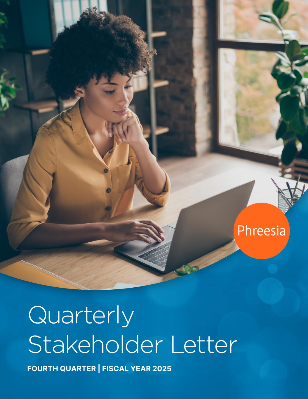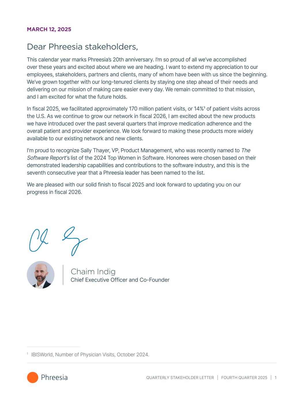 QUARTERLY STAKEHOLDER LETTER | FOURTH QUARTER 2025 | 1 MARCH 12, 2025 Dear Phreesia stakeholders, This calendar year marks Phreesia’s 20th anniversary. I’m so proud of all we’ve accomplished over these years and excited about where we are heading. I want to extend my appreciation to our employees, stakeholders, partners and clients, many of whom have been with us since the beginning. We’ve grown together with our long-tenured clients by staying one step ahead of their needs and delivering on our mission of making care easier every day. We remain committed to that mission, and I am excited for what the future holds. In fiscal 2025, we facilitated approximately 170 million patient visits, or 14%1 of patient visits across the U.S. As we continue to grow our network in fiscal 2026, I am excited about the new products we have introduced over the past several quarters that improve medication adherence and the overall patient and provider experience. We look forward to making these products more widely available to our existing network and new clients. I'm proud to recognize Sally Thayer, VP, Product Management, who was recently named to The Software Report’s list of the 2024 Top Women in Software. Honorees were chosen based on their demonstrated leadership capabilities and contributions to the software industry, and this is the seventh consecutive year that a Phreesia leader has been named to the list. We are pleased with our solid finish to fiscal 2025 and look forward to updating you on our progress in fiscal 2026. Chaim Indig Chief Executive Officer and Co-Founder 1 IBISWorld, Number of Physician Visits, October 2024.