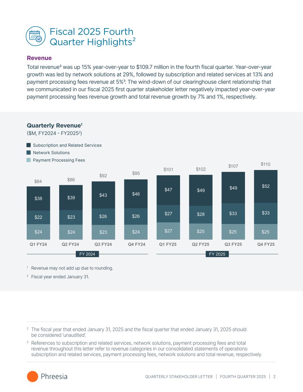 QUARTERLY STAKEHOLDER LETTER | FOURTH QUARTER 2025 | 2 Fiscal 2025 Fourth Quarter Highlights² Revenue Total revenue3 was up 15% year-over-year to $109.7 million in the fourth fiscal quarter. Year-over-year growth was led by network solutions at 29%, followed by subscription and related services at 13% and payment processing fees revenue at 5%3. The wind-down of our clearinghouse client relationship that we communicated in our fiscal 2025 first quarter stakeholder letter negatively impacted year-over-year payment processing fees revenue growth and total revenue growth by 7% and 1%, respectively. 1 Revenue may not add up due to rounding. 2 Fiscal year ended January 31. Subscription and Related Services Payment Processing Fees Network Solutions Quarterly Revenue1 ($M, FY2024 - FY20252) 2 The fiscal year that ended January 31, 2025 and the fiscal quarter that ended January 31, 2025 should be considered ‘unaudited’. 3 References to subscription and related services, network solutions, payment processing fees and total revenue throughout this letter refer to revenue categories in our consolidated statements of operations: subscription and related services, payment processing fees, network solutions and total revenue, respectively.