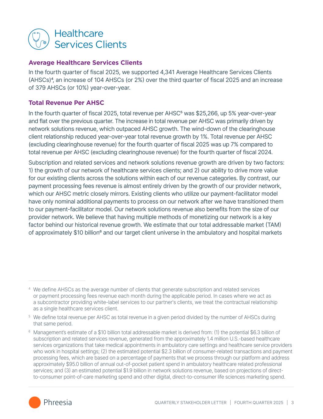 QUARTERLY STAKEHOLDER LETTER | FOURTH QUARTER 2025 | 3 Healthcare Services Clients Average Healthcare Services Clients In the fourth quarter of fiscal 2025, we supported 4,341 Average Healthcare Services Clients (AHSCs)4, an increase of 104 AHSCs (or 2%) over the third quarter of fiscal 2025 and an increase of 379 AHSCs (or 10%) year-over-year. Total Revenue Per AHSC In the fourth quarter of fiscal 2025, total revenue per AHSC5 was $25,266, up 5% year-over-year and flat over the previous quarter. The increase in total revenue per AHSC was primarily driven by network solutions revenue, which outpaced AHSC growth. The wind-down of the clearinghouse client relationship reduced year-over-year total revenue growth by 1%. Total revenue per AHSC (excluding clearinghouse revenue) for the fourth quarter of fiscal 2025 was up 7% compared to total revenue per AHSC (excluding clearinghouse revenue) for the fourth quarter of fiscal 2024. Subscription and related services and network solutions revenue growth are driven by two factors: 1) the growth of our network of healthcare services clients; and 2) our ability to drive more value for our existing clients across the solutions within each of our revenue categories. By contrast, our payment processing fees revenue is almost entirely driven by the growth of our provider network, which our AHSC metric closely mirrors. Existing clients who utilize our payment-facilitator model have only nominal additional payments to process on our network after we have transitioned them to our payment-facilitator model. Our network solutions revenue also benefits from the size of our provider network. We believe that having multiple methods of monetizing our network is a key factor behind our historical revenue growth. We estimate that our total addressable market (TAM) of approximately $10 billion6 and our target client universe in the ambulatory and hospital markets 4 We define AHSCs as the average number of clients that generate subscription and related services or payment processing revenue each month during the applicable period. In cases where we act as a subcontractor providing white-label services to our partner's clients, we treat the contractual relationship as a single healthcare services client. 4 We define AHSCs as the average number of clients that generate subscription and related services or payment processing fees revenue each month during the applicable period. In cases where we act as a subcontractor providing white-label services to our partner's clients, we treat the contractual relationship as a single healthcare services client. 5 We define total revenue per AHSC as total revenue in a given period divided by the number of AHSCs during that same period. 6 Management’s estimate of a $10 billion total addressable market is derived from: (1) the potential $6.3 billion of subscription and related services revenue, generated from the approximately 1.4 million U.S.-based healthcare services organizations that take medical appointments in ambulatory care settings and healthcare service providers who work in hospital settings; (2) the estimated potential $2.3 billion of consumer-related transactions and payment processing fees, which are based on a percentage of payments that we process through our platform and address approximately $95.0 billion of annual out-of-pocket patient spend in ambulatory healthcare related professional services; and (3) an estimated potential $1.9 billion in network solutions revenue, based on projections of direct- to-consumer point-of-care marketing spend and other digital, direct-to-consumer life sciences marketing spend.