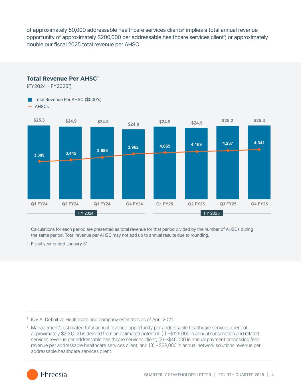 QUARTERLY STAKEHOLDER LETTER | FOURTH QUARTER 2025 | 4 of approximately 50,000 addressable healthcare services clients7 implies a total annual revenue opportunity of approximately $200,000 per addressable healthcare services client8, or approximately double our fiscal 2025 total revenue per AHSC. 7 IQVIA, Definitive Healthcare and company estimates as of April 2021. 8 Management’s estimated total annual revenue opportunity per addressable healthcare services client of approximately $200,000 is derived from an estimated potential: (1) ~$126,000 in annual subscription and related services revenue per addressable healthcare services client; (2) ~$46,000 in annual payment processing fees revenue per addressable healthcare services client; and (3) ~$38,000 in annual network solutions revenue per addressable healthcare services client. 1 Calculations for each period are presented as total revenue for that period divided by the number of AHSCs during the same period. Total revenue per AHSC may not add up to annual results due to rounding. 2 Fiscal year ended January 31. Total Revenue Per AHSC¹ (FY2024 - FY20252) Total Revenue Per AHSC ($000ʼs) AHSCs