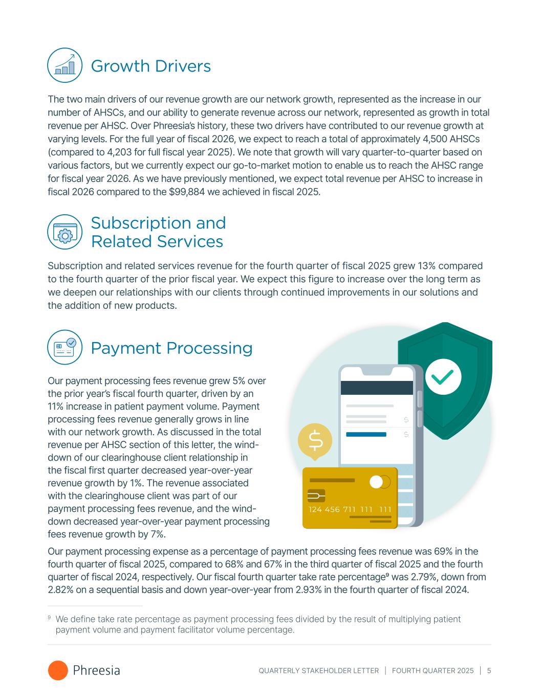 QUARTERLY STAKEHOLDER LETTER | FOURTH QUARTER 2025 | 5 Growth Drivers The two main drivers of our revenue growth are our network growth, represented as the increase in our number of AHSCs, and our ability to generate revenue across our network, represented as growth in total revenue per AHSC. Over Phreesia’s history, these two drivers have contributed to our revenue growth at varying levels. For the full year of fiscal 2026, we expect to reach a total of approximately 4,500 AHSCs (compared to 4,203 for full fiscal year 2025). We note that growth will vary quarter-to-quarter based on various factors, but we currently expect our go-to-market motion to enable us to reach the AHSC range for fiscal year 2026. As we have previously mentioned, we expect total revenue per AHSC to increase in fiscal 2026 compared to the $99,884 we achieved in fiscal 2025. Subscription and Related Services Subscription and related services revenue for the fourth quarter of fiscal 2025 grew 13% compared to the fourth quarter of the prior fiscal year. We expect this figure to increase over the long term as we deepen our relationships with our clients through continued improvements in our solutions and the addition of new products. Payment Processing Our payment processing fees revenue grew 5% over the prior year’s fiscal fourth quarter, driven by an 11% increase in patient payment volume. Payment processing fees revenue generally grows in line with our network growth. As discussed in the total revenue per AHSC section of this letter, the wind- down of our clearinghouse client relationship in the fiscal first quarter decreased year-over-year revenue growth by 1%. The revenue associated with the clearinghouse client was part of our payment processing fees revenue, and the wind- down decreased year-over-year payment processing fees revenue growth by 7%. Our payment processing expense as a percentage of payment processing fees revenue was 69% in the fourth quarter of fiscal 2025, compared to 68% and 67% in the third quarter of fiscal 2025 and the fourth quarter of fiscal 2024, respectively. Our fiscal fourth quarter take rate percentage9 was 2.79%, down from 2.82% on a sequential basis and down year-over-year from 2.93% in the fourth quarter of fiscal 2024. 9 We define take rate percentage as payment processing fees divided by the result of multiplying patient payment volume and payment facilitator volume percentage.