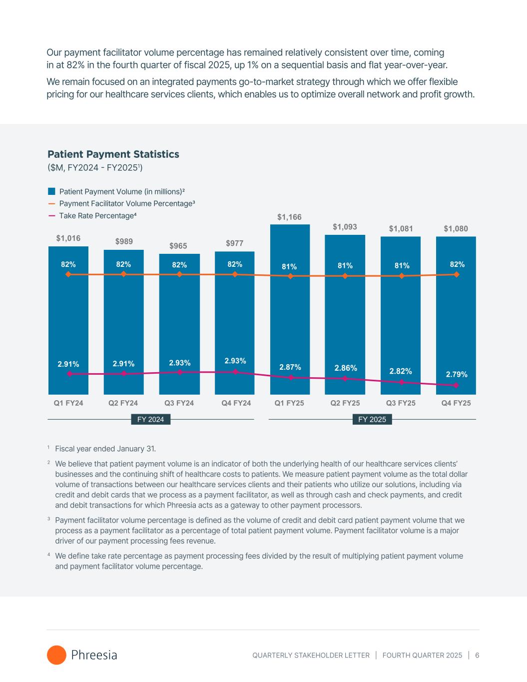 QUARTERLY STAKEHOLDER LETTER | FOURTH QUARTER 2025 | 6 Our payment facilitator volume percentage has remained relatively consistent over time, coming in at 82% in the fourth quarter of fiscal 2025, up 1% on a sequential basis and flat year-over-year. We remain focused on an integrated payments go-to-market strategy through which we offer flexible pricing for our healthcare services clients, which enables us to optimize overall network and profit growth. Patient Payment Statistics ($M, FY2024 - FY20251) 1 Fiscal year ended January 31. 2 We believe that patient payment volume is an indicator of both the underlying health of our healthcare services clients’ businesses and the continuing shift of healthcare costs to patients. We measure patient payment volume as the total dollar volume of transactions between our healthcare services clients and their patients who utilize our solutions, including via credit and debit cards that we process as a payment facilitator, as well as through cash and check payments, and credit and debit transactions for which Phreesia acts as a gateway to other payment processors. 3 Payment facilitator volume percentage is defined as the volume of credit and debit card patient payment volume that we process as a payment facilitator as a percentage of total patient payment volume. Payment facilitator volume is a major driver of our payment processing fees revenue. 4 We define take rate percentage as payment processing fees divided by the result of multiplying patient payment volume and payment facilitator volume percentage. 81% 81% 81% Patient Payment Volume (in millions)2 Take Rate Percentage4 Payment Facilitator Volume Percentage3